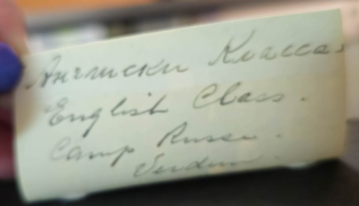 - Snapshot of a group of men, some in uniform, sitting around a table. Handwritten label on back says "[illegible] English Class. Camp Russe. Verdun." This is an item in a scrapbook.