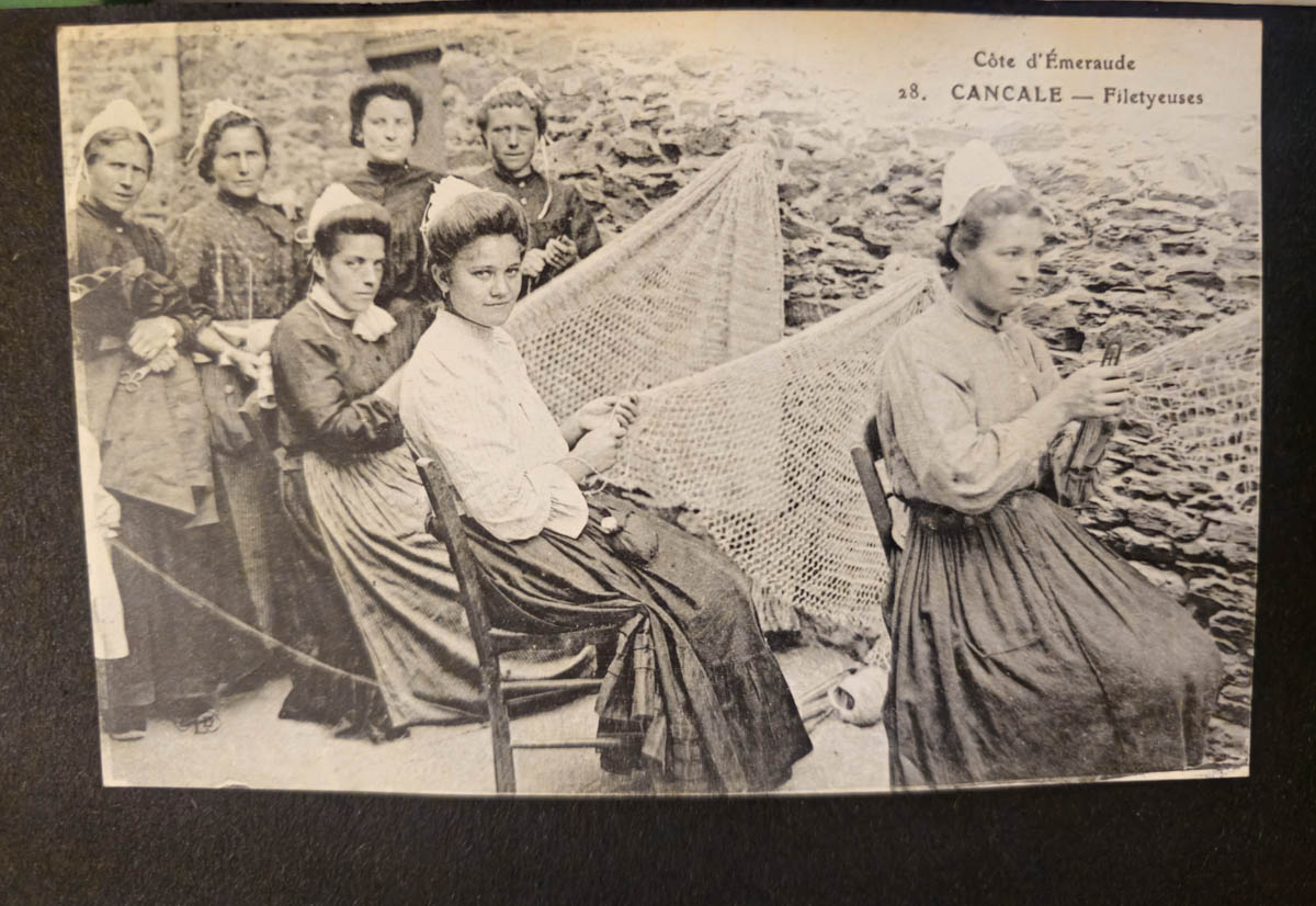 - Postcard view of women making fishing nets. This is an item in a scrapbook.