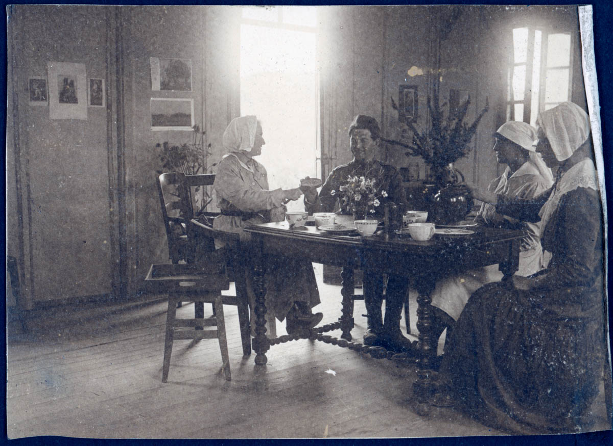 - Snapshot of a man in uniform having tea with three women. This is an item in a scrapbook.