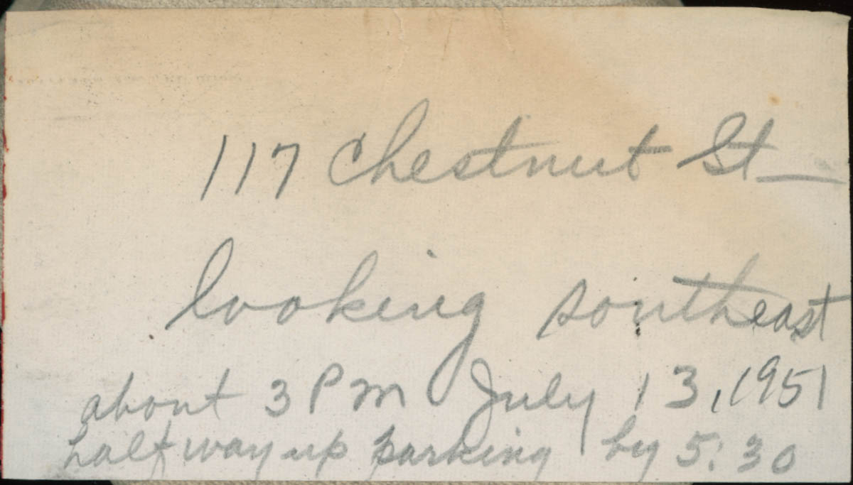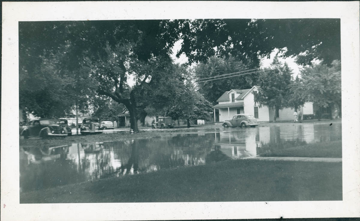 - Snapshot of a flood in Halstead. Handwritten label on back says "117 Chestnut St -- looking southeast about 3pm July 13, 1951 half way up parking by 5:30." This is an item in a scrapbook.