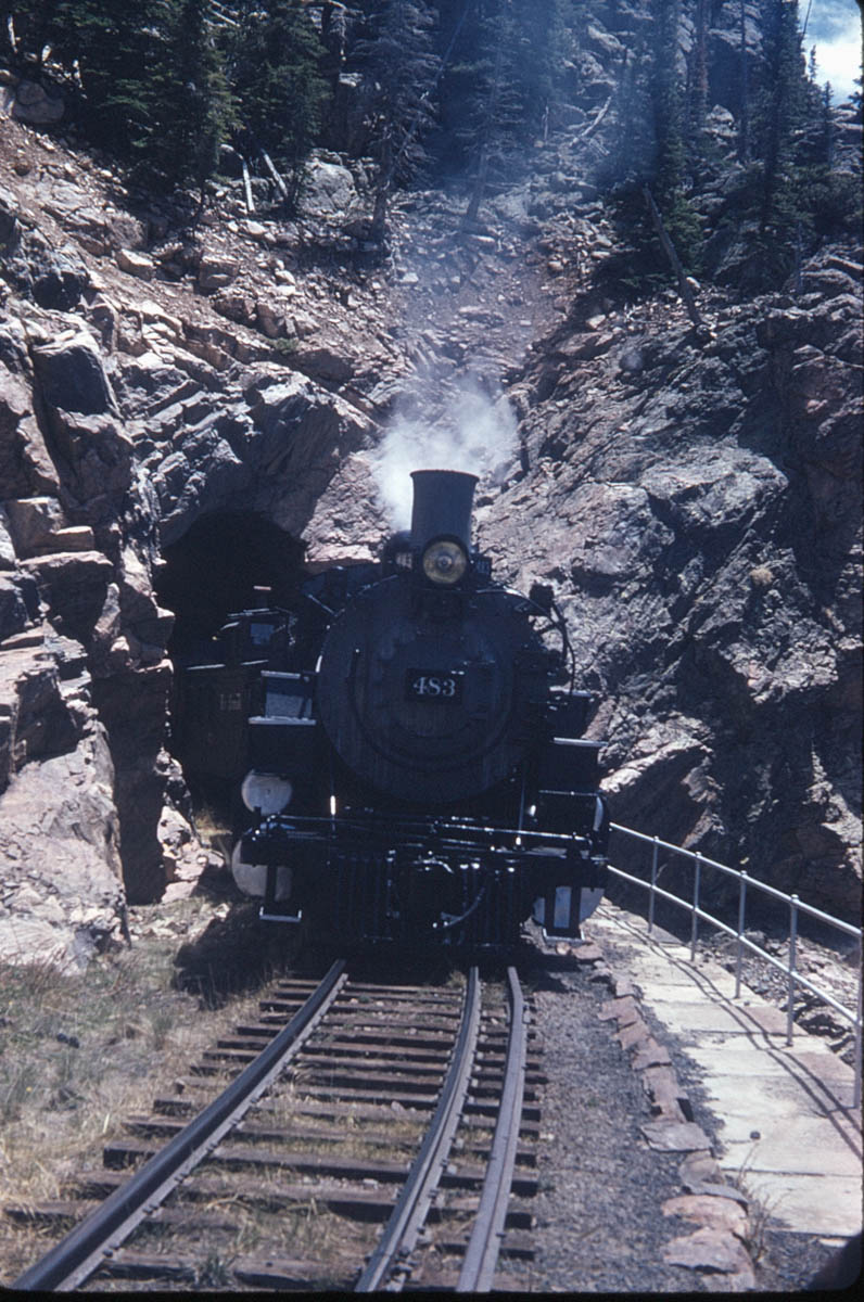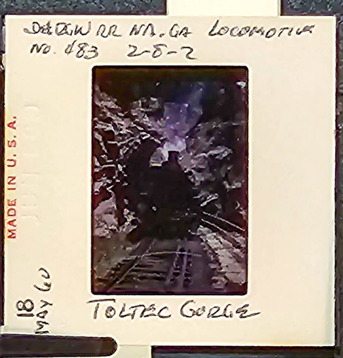 - Snapshot of a train. Handwritten label on slide says "May 60 D&RGW Na Ga Locomotive 483, 2-8-2 Toltec Gorge."