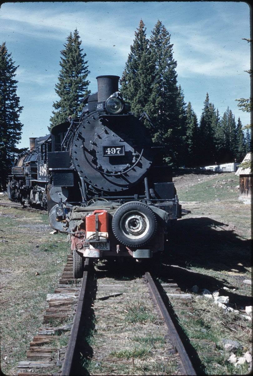 - Snapshot of a train. Handwritten label on slide says "May 60 [illegible] & 497 - Top of Cumbres."