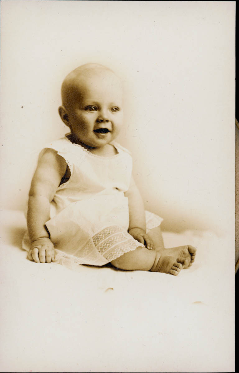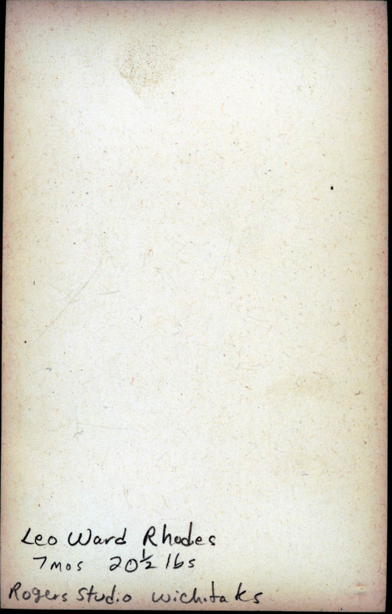 - Portrait of a baby. Handwritten label on back says "Leo Ward Rhodes 7 mos 20 1/2 lbs Rogers Studio Wichita, KS