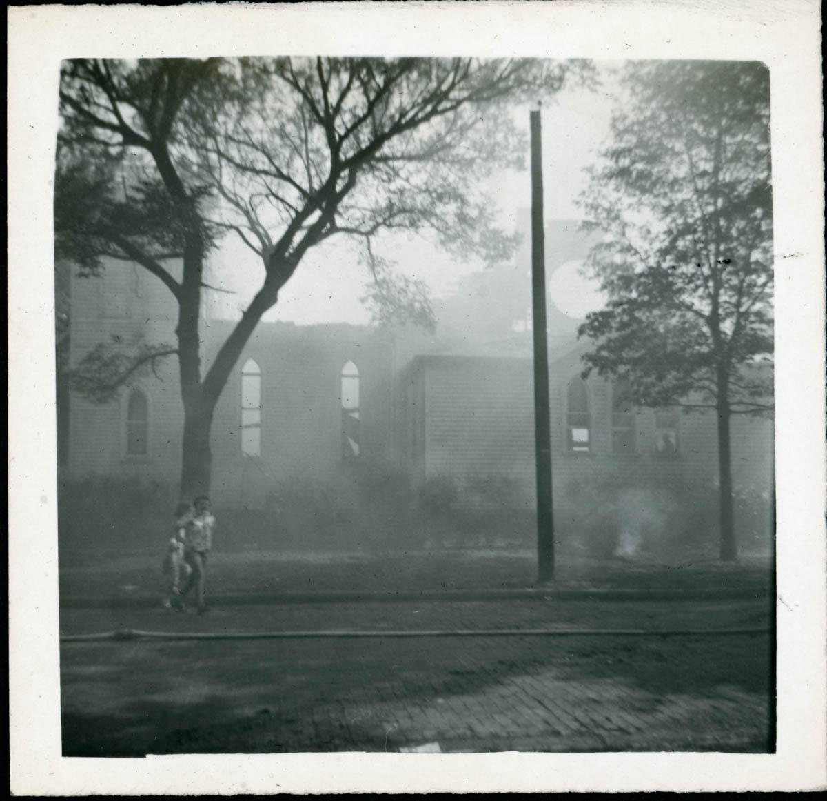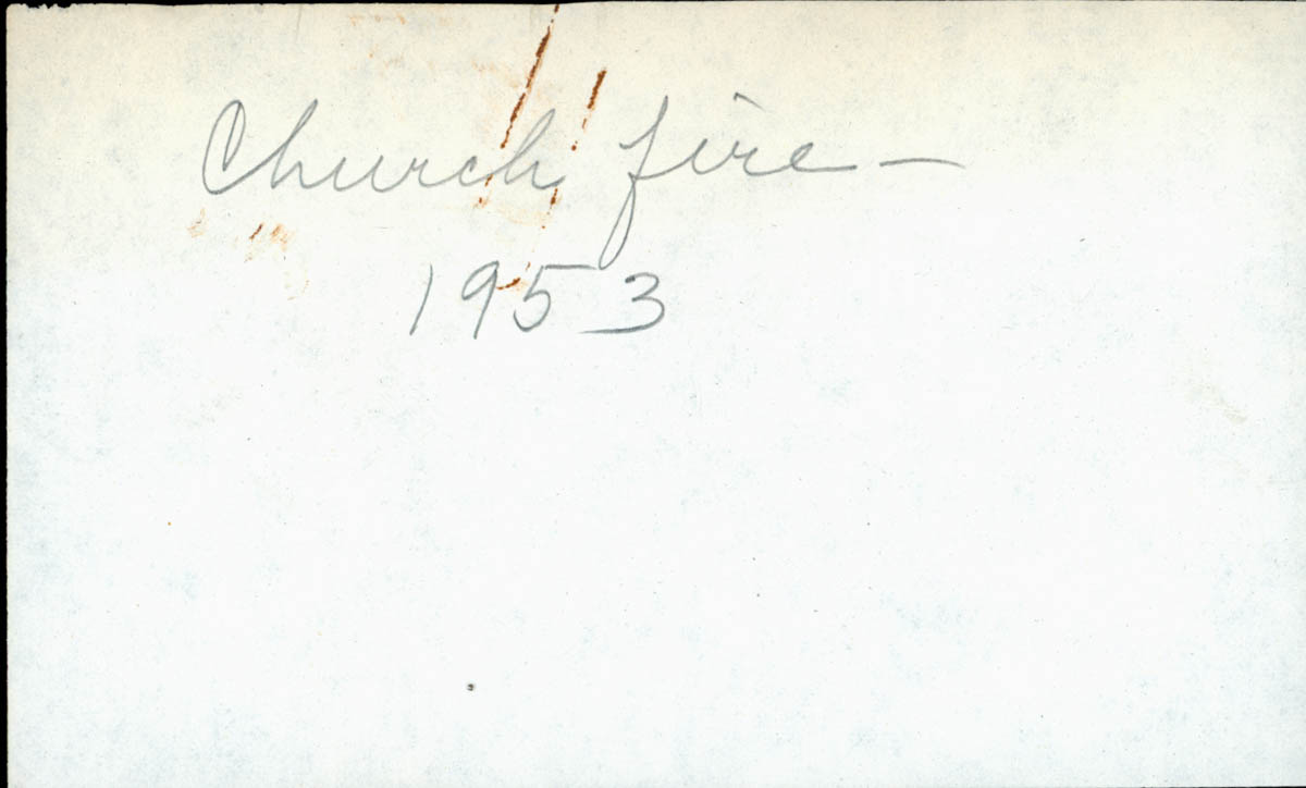 - Picture of a burned church building. Handwritten note on page says "Church fire 1953." This is an item in a scrapbook.