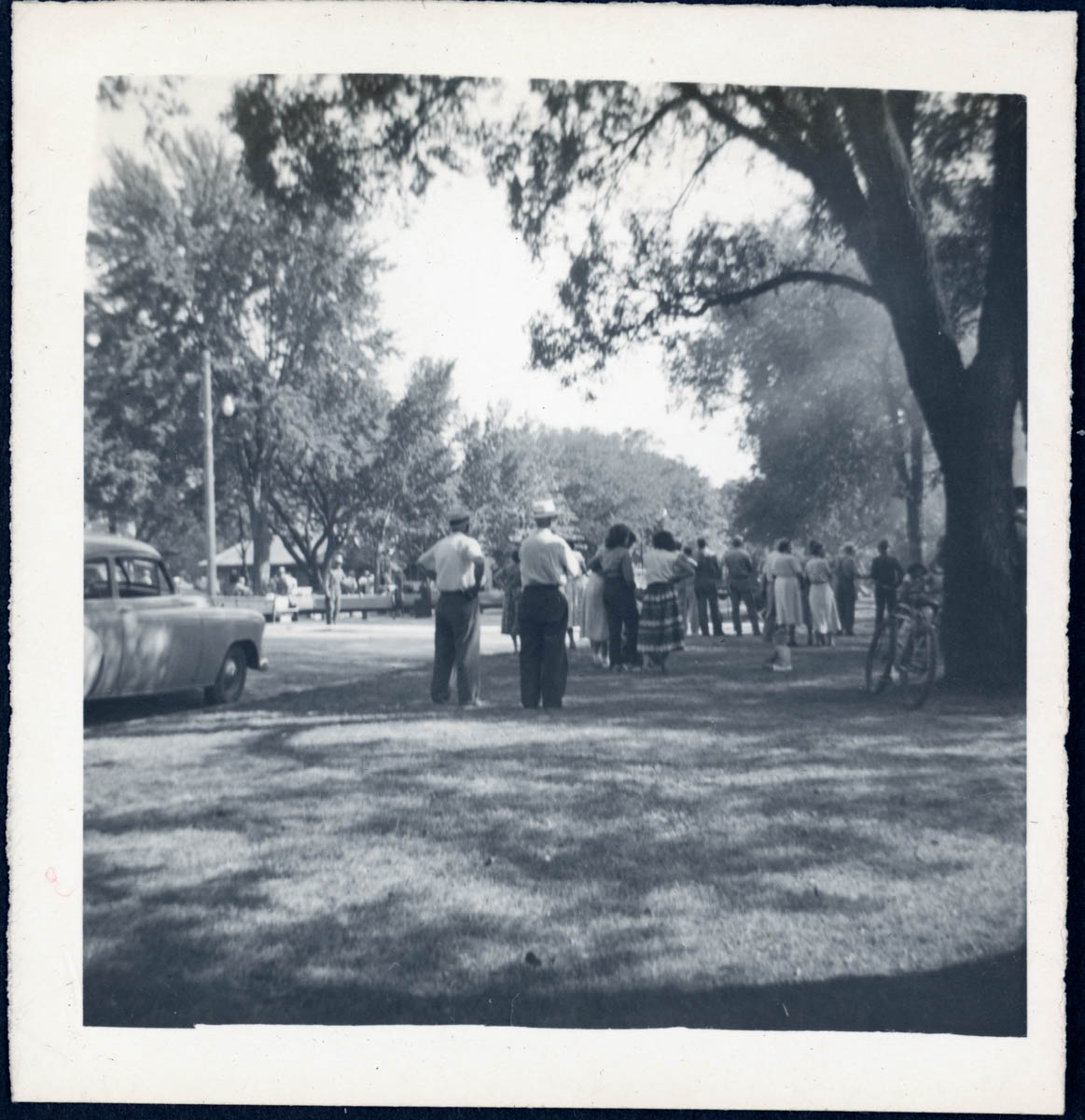 - Picture of people standing along a street watching a fire. Handwritten note on page says "Church fire 1953." This is an item in a scrapbook.