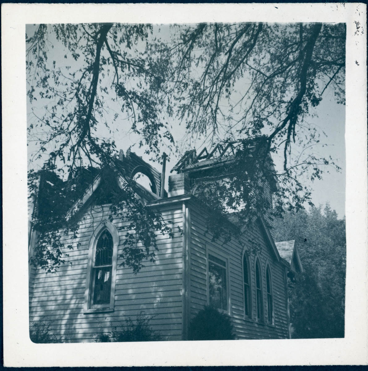 - Picture of a church damaged by fire. Handwritten note on page says "Church fire 1953." This is an item in a scrapbook.