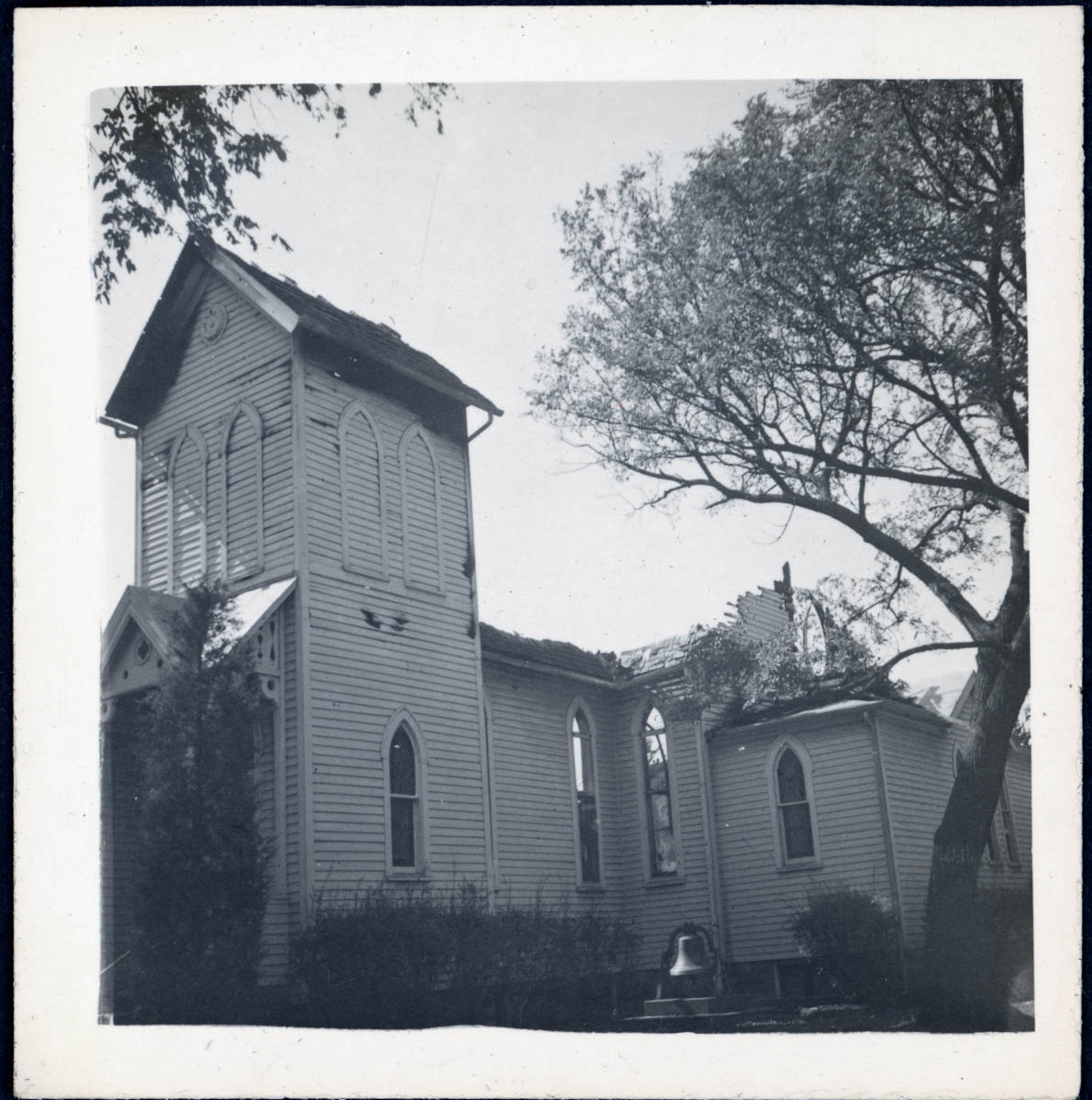 - Picture of a church damaged by fire. This is an item in a scrapbook.