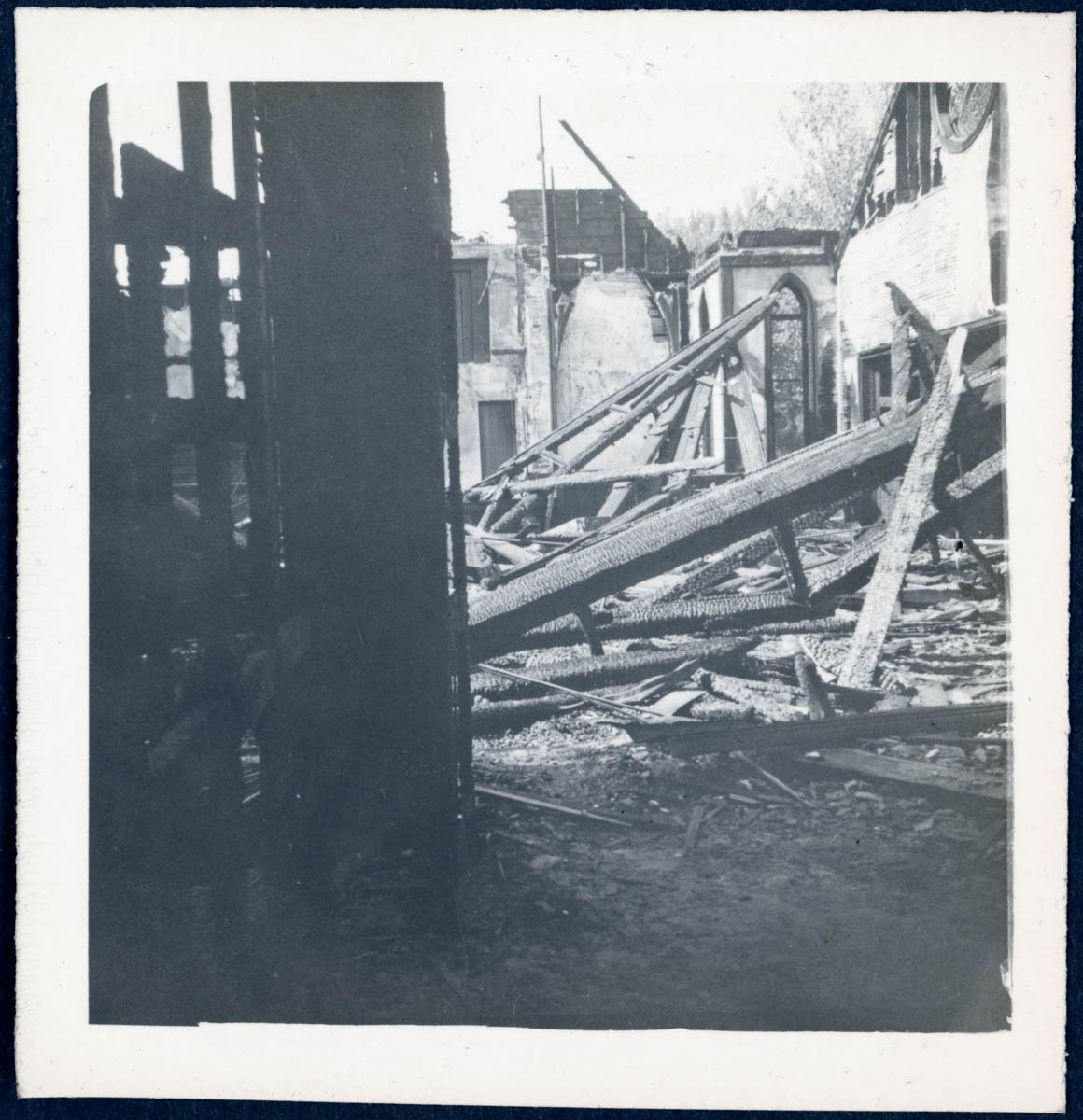 - Picture of a church damaged by fire. This is an item in a scrapbook.