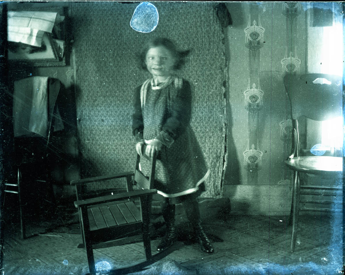 - Portrait of a girl standing behind a rocking chair. Because of our scanning procedure, this image is most likely flipped horizontally.