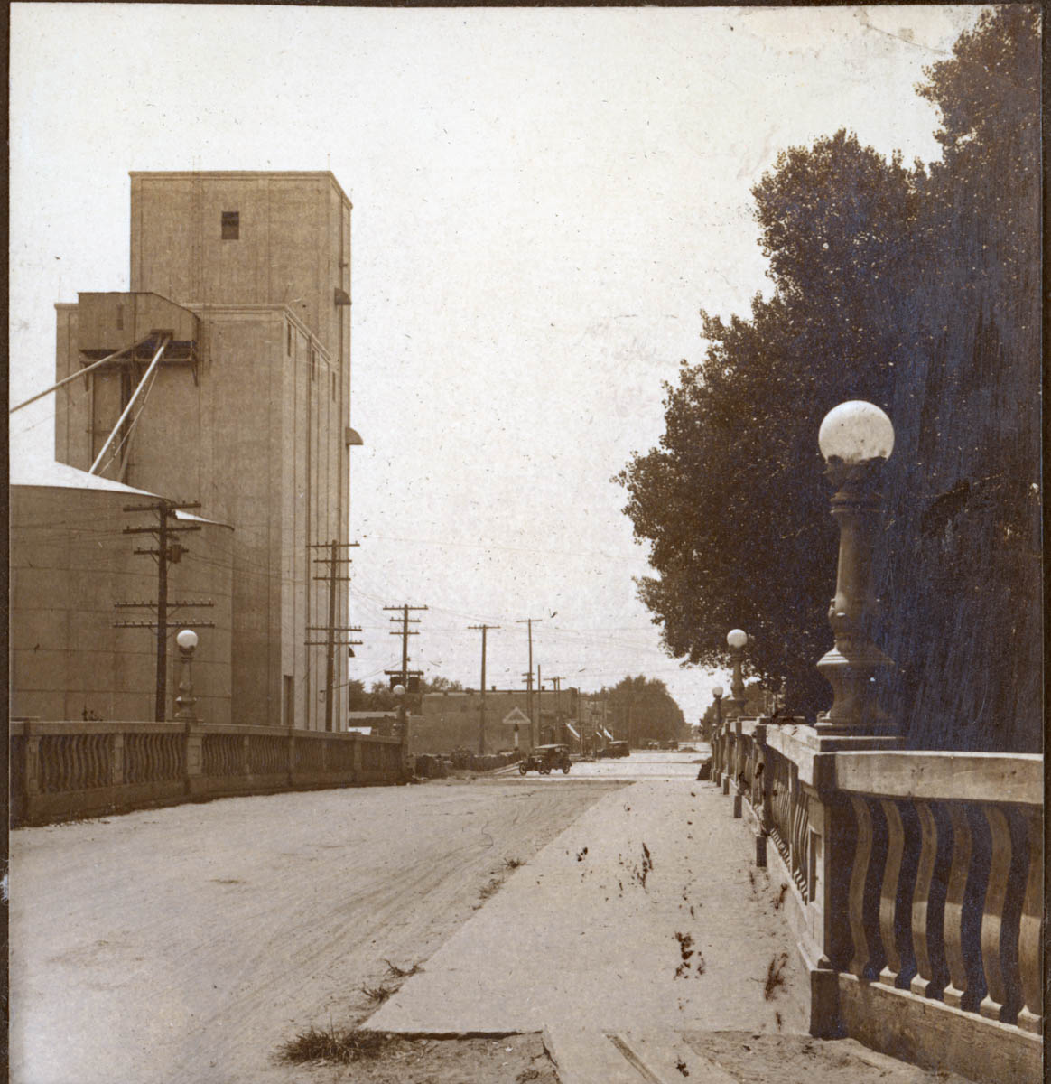 - Picture of a bridge, grain elevator and a small town street. This is an item in a scrapbook.