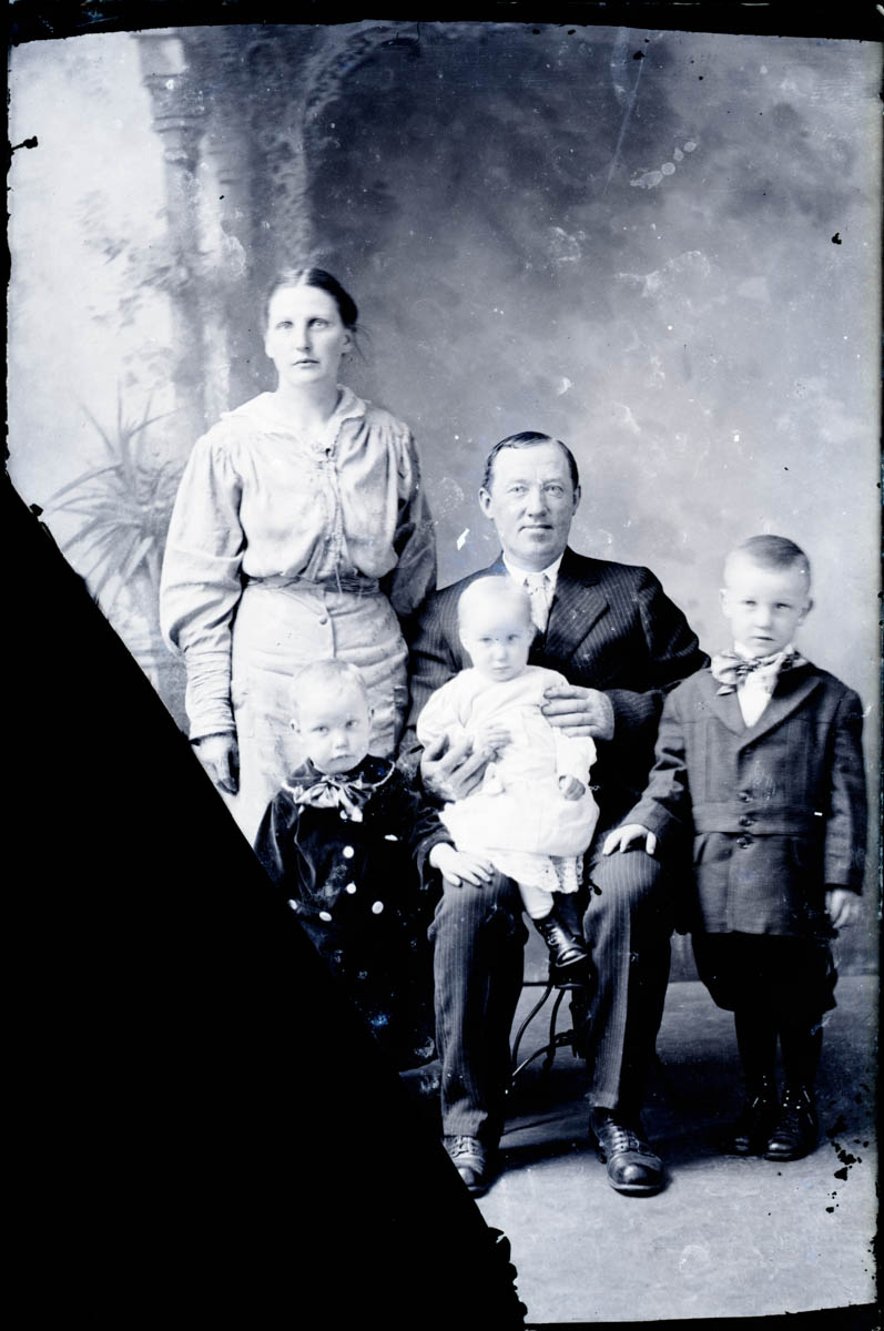 - Studio portrait of a man, woman and three children. There is a missing corner. Because of our scanning procedure, this image is most likely flipped horizontally.