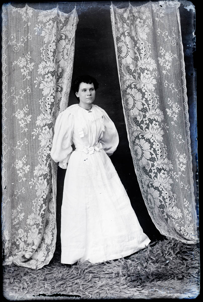 - Studio portrait of a woman standing between lace curtains. Handwritten label on plate says "[?] Lola A." Because of our scanning procedure, this image is most likely flipped horizontally.