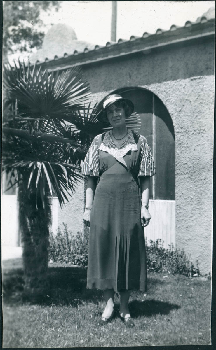 - Snapshot of a woman standing in front of a hotel. Notes attached to the scrapbook page say "Helen and Flavio, etc after 1938. El Paso 4. Helen and Flavio at their apt. and at Camp Grande (motel)" This is an item in a scrapbook.