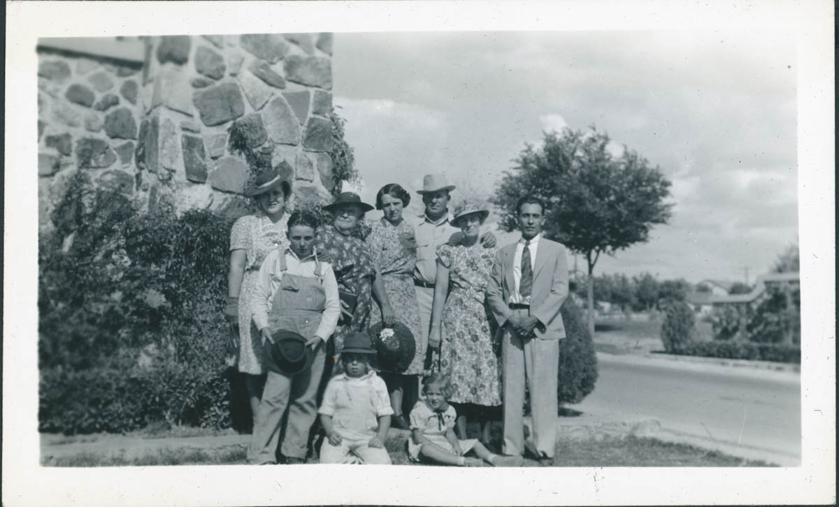 - Snapshot of a family standing by a building. Notes attached to the scrapbook page say "Helen and Flavio, etc after 1938. El Paso 4. Daisy, Minnie, Jay, Edward, Helen, Flavio and Jay's 3 children." This is an item in a scrapbook.