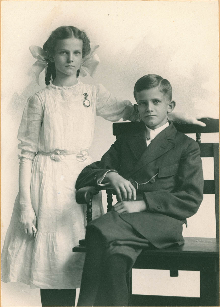 - Portrait of a young girl and boy. Handwritten label on front says "Edith Sortor (Starry) Harold Sortor"