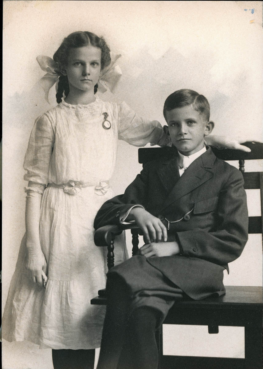 - Portrait of a young girl and boy. Handwritten label on front says "Edith & Harold"