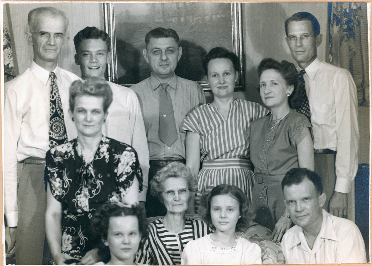 - Portrait of eleven people. Handwritten label on back says "Harold, Ralph Jr, Don A Starry, Beulah Sortor, Carolyn & Ralph Sortor, Edith Sortor Starry, Edith Sortor, Ida Sortor, Patricia Sortor, Norman Sortor"