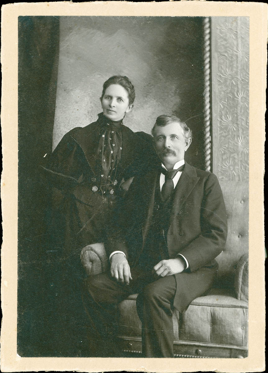 - Portrait of a man and woman. Handwritten label on back says "John R. Lucas & wife Cynthia Sortor [Cynthia Sortor is dau. of Elisha & Effie Ann Sortor & sister of Fred Sortor]"