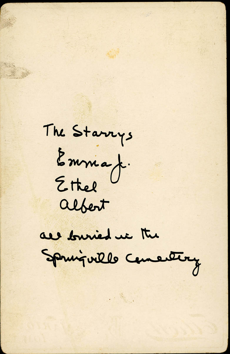 - Portrait of a family. Handwritten label on back says "The Starrys -- Emma J., Ethel, Albert all buried in the Springville Cemetery"