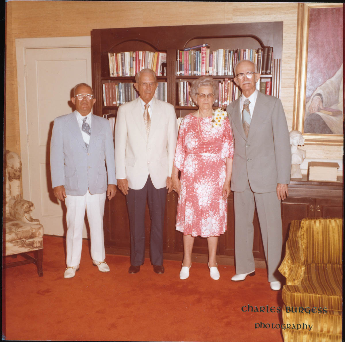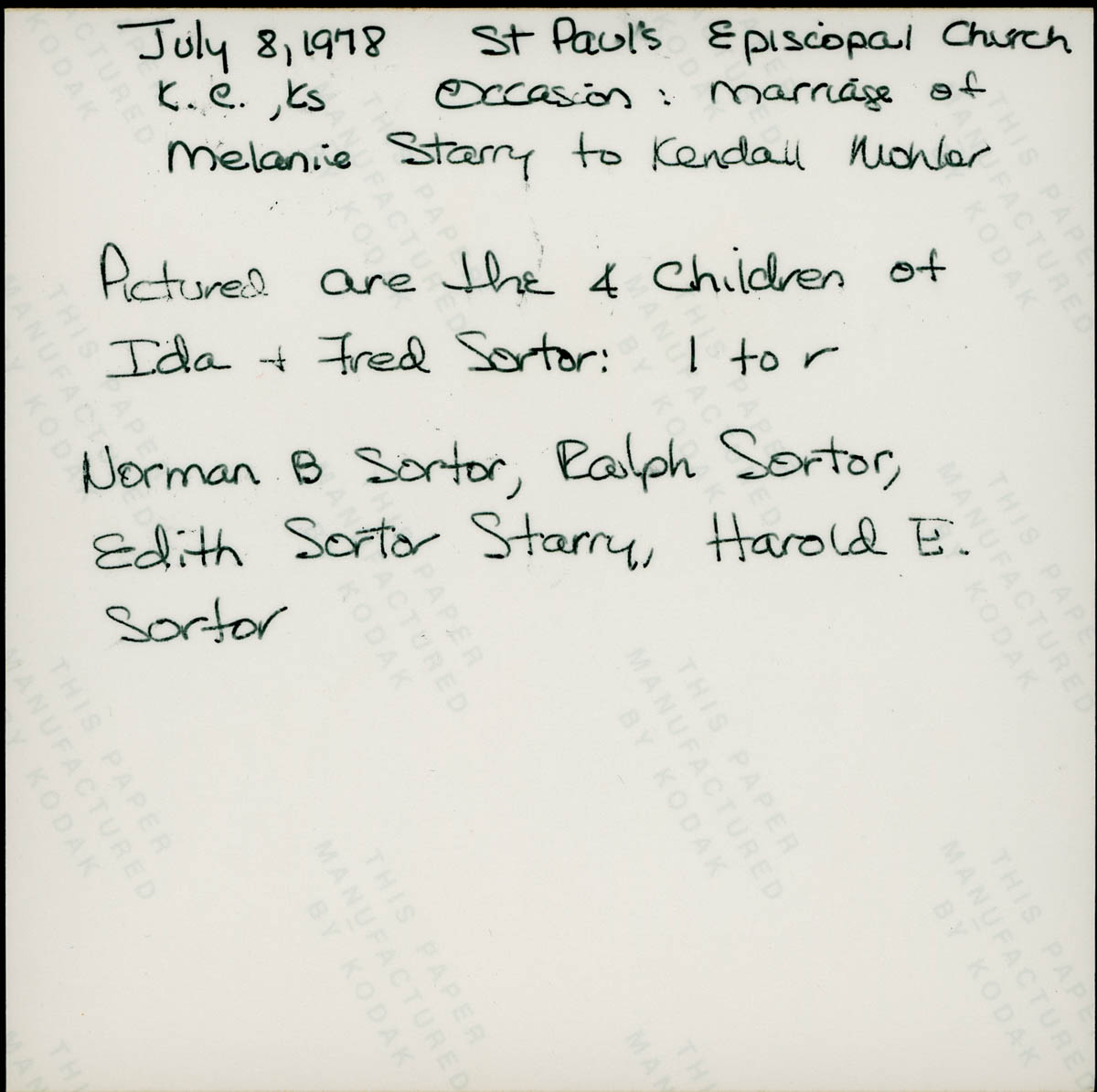 - Picture of four people posing in church library. Handwritten label on back says "July 8, 1978 St Paul's Episcopal Church K C, Ks. Occasion: Marriage of Melanie Starry to Kendall Mohler. Pictured are the 4 children of Ida & Fred Sortor: l to r Norman B Sortor, Ralph Sortor, Edith Sortor Starry, Harold E Sortor"