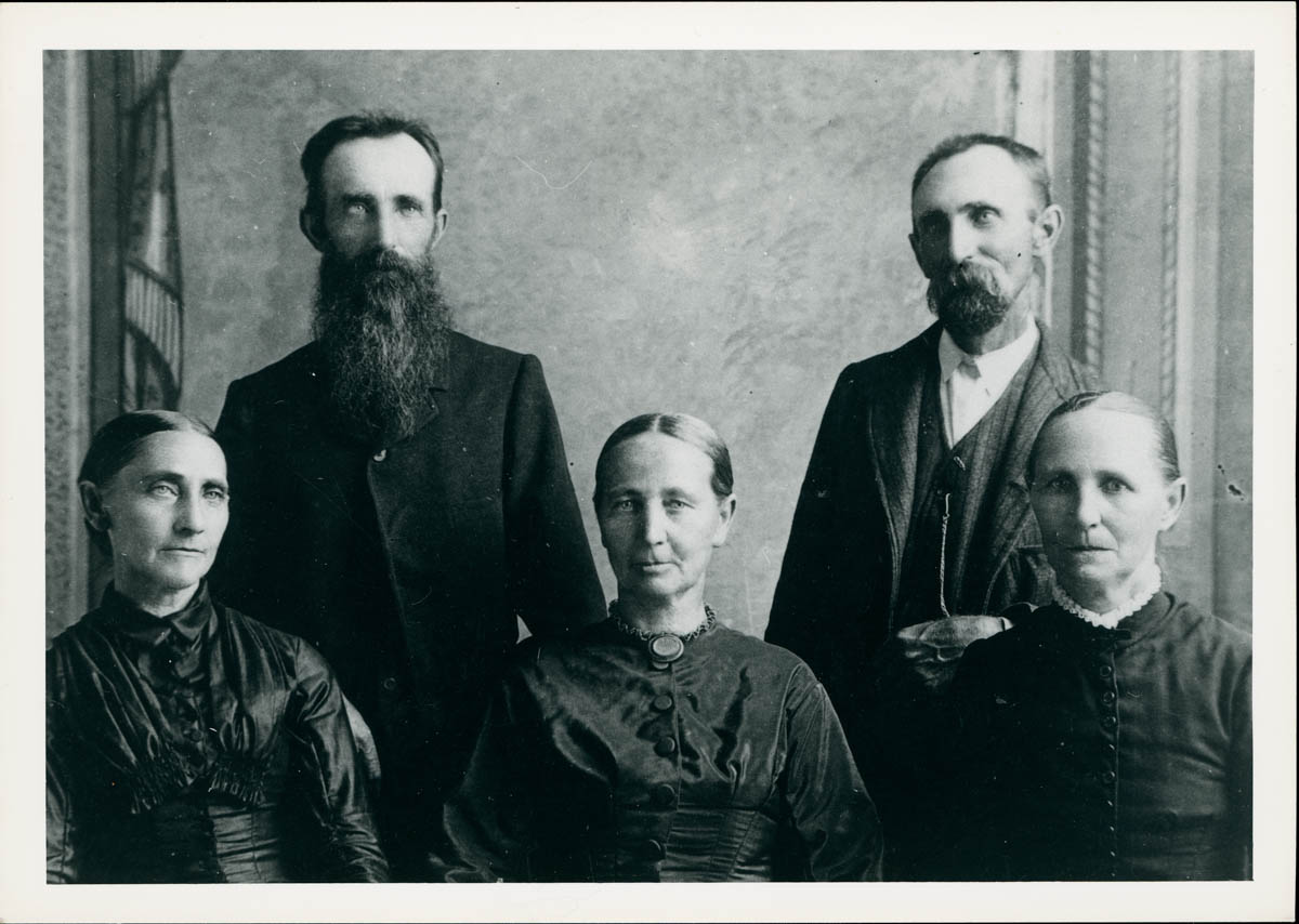 - Portrait of five people. Handwritten label on back says "Christoph W Horstman Family (brothers & sisters) Back: Christian F., Ludwig Albert; Front: Marie Caroline (Spaeth), Marie Christine Louise (Studt), Marie Christine Louise (Bruni)"