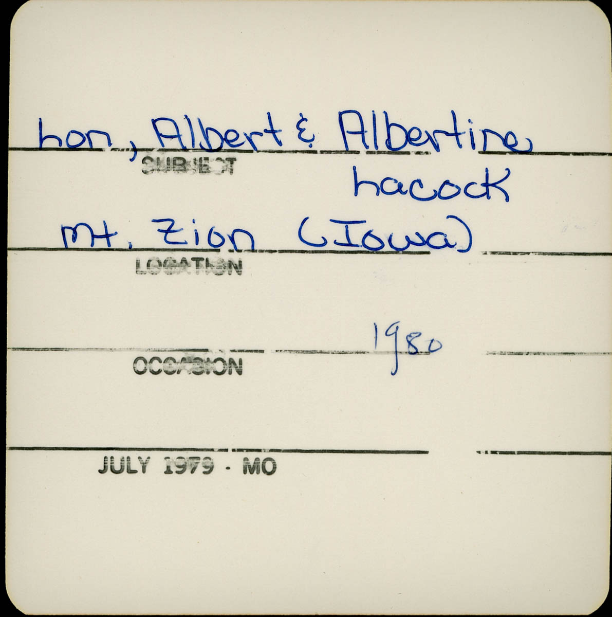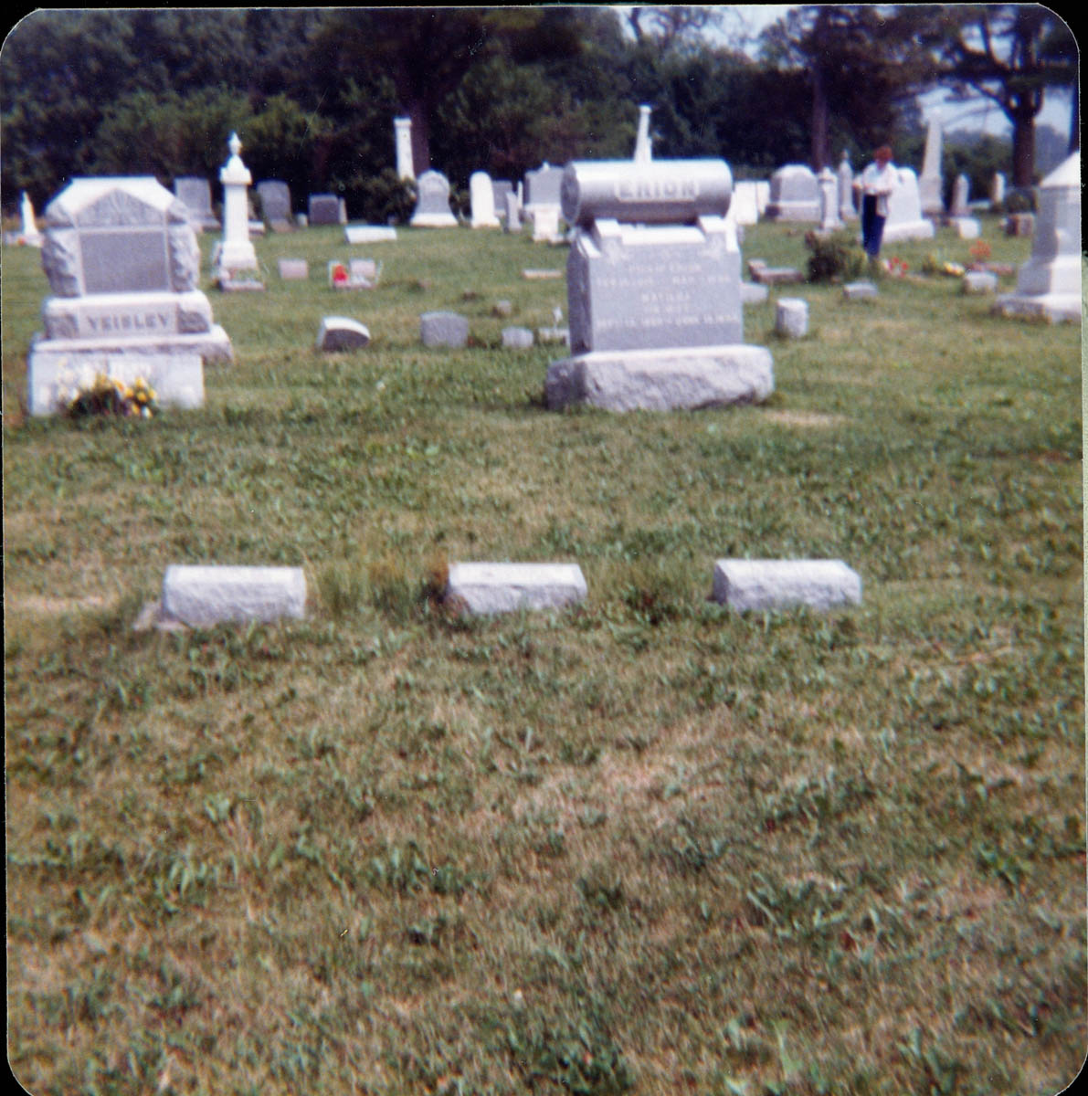- Snapshot of three granite cemetery markers. Handwritten label on back says "Lon, Albert & Albertina Lacock, Mt. Zion (Iowa) 1980"