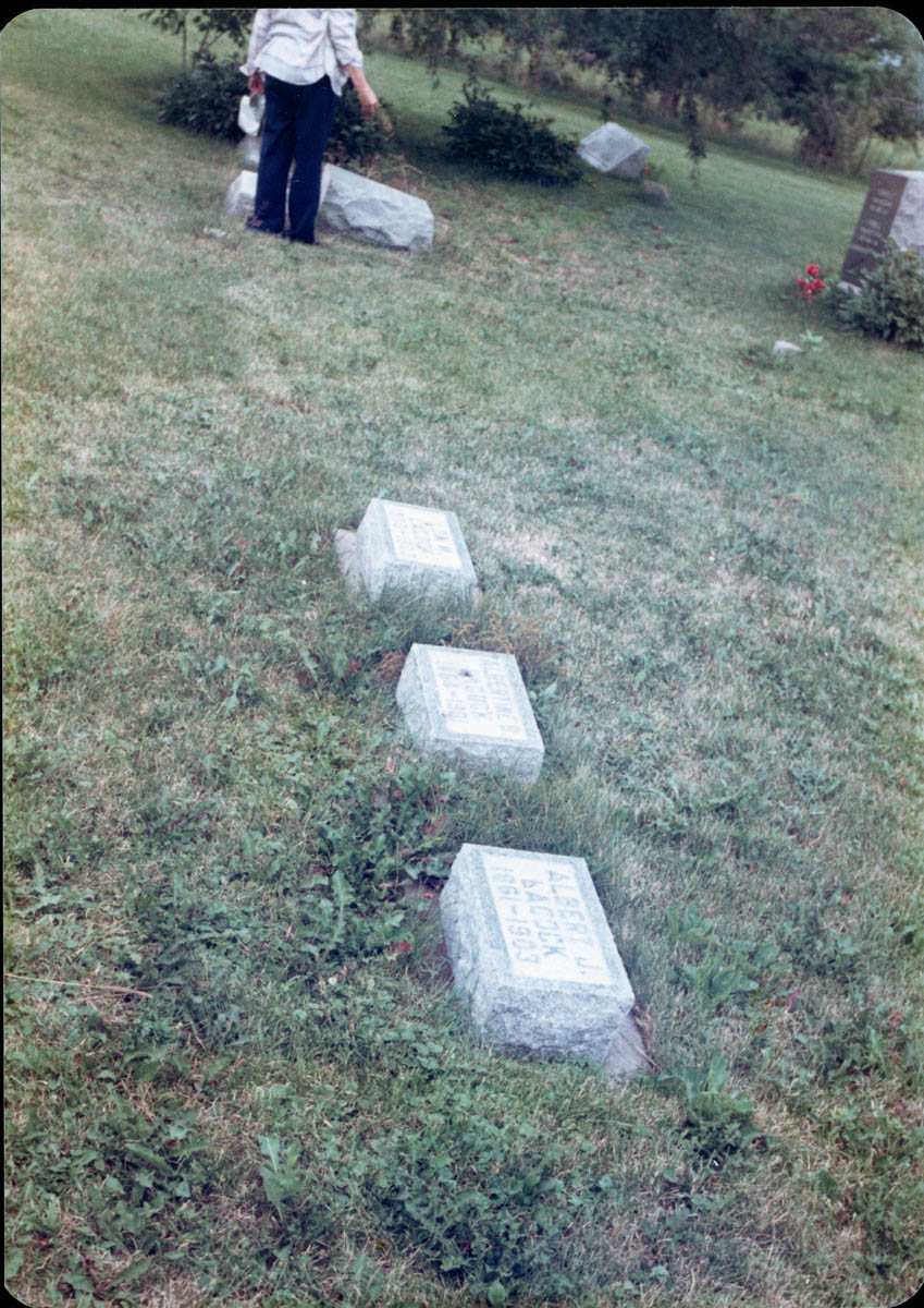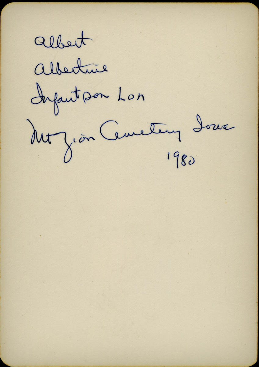 - Snapshot of three granite cemetery markers. Handwritten label on back says "Albert, Albertina, Infant son Lon, Mt. Zion Cemetery Iowa 1980"