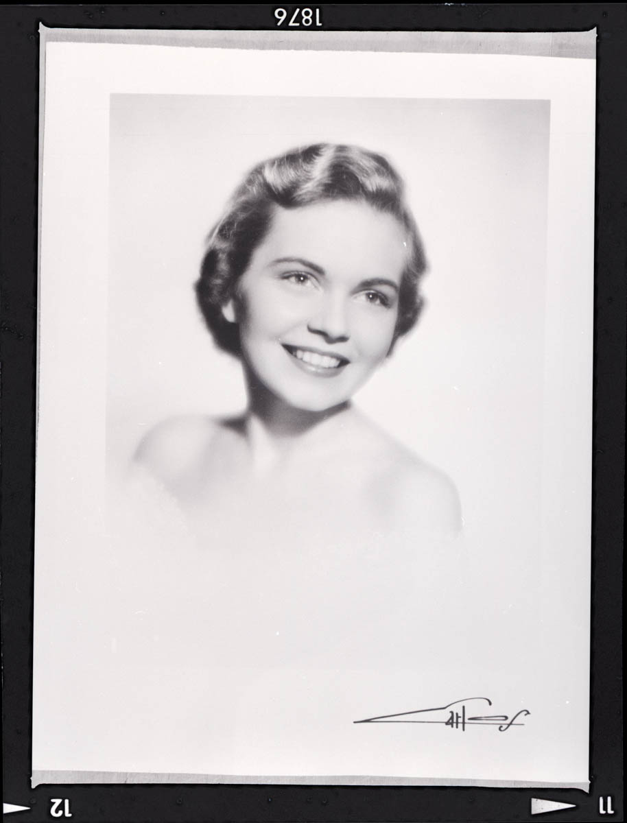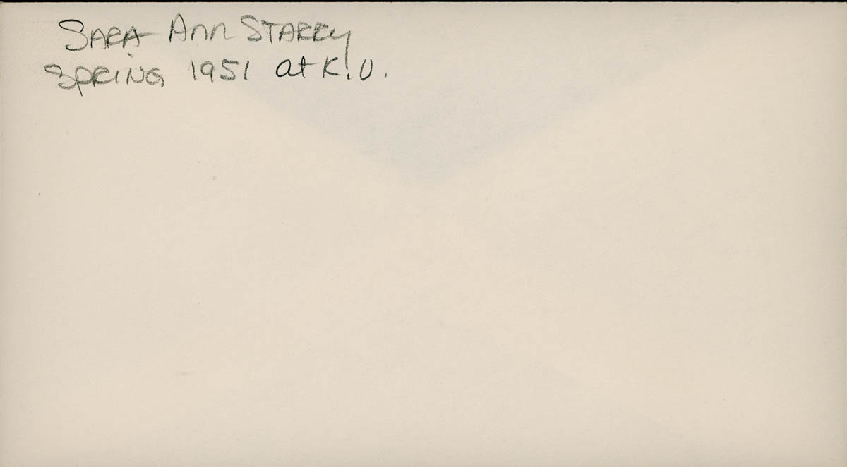 - Portrait of a woman. Handwritten label on back says "Sara Ann Starry Spring 1951 at K.U."