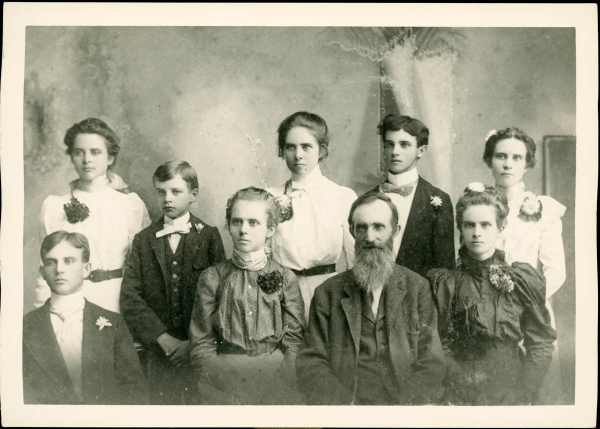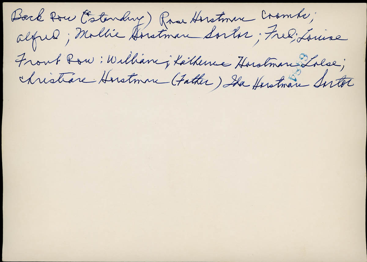 - Portrait of nine people. Handwritten label on back says "Back row (standing) Rose Horstman Combs, Alfred, Mollie Horstman Sortor, Fred, Louise; Front Row: William, Katherine Horstman Loese, Christian Horstman (Father), Ida Horstman Sortor"