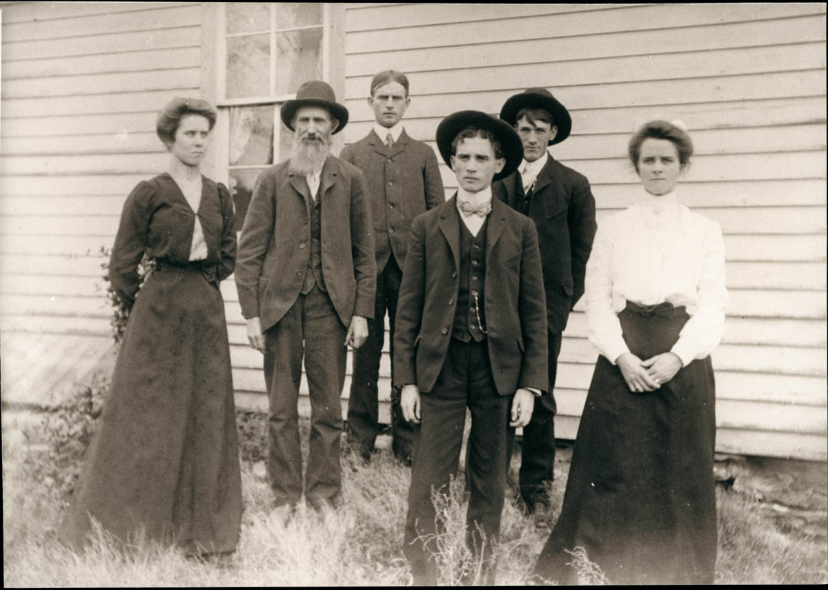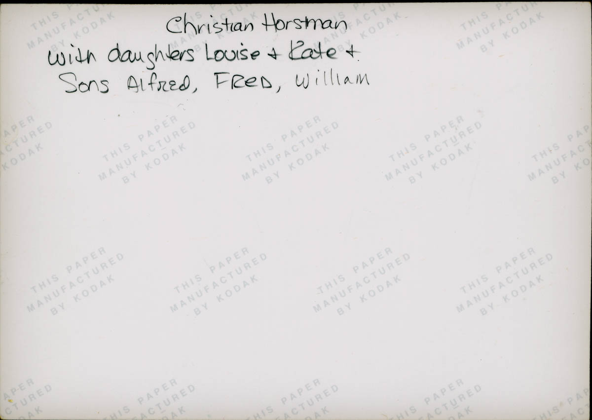 - Portrait of nine people. Handwritten label on back says "Christian Horstman with daughters Louise & Kate & sons Alfred, Fred, William"
