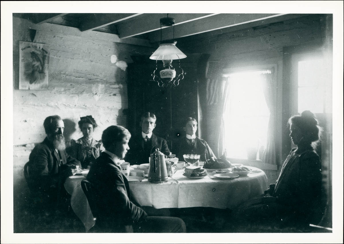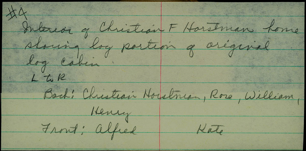 - Snapshot of six people sitting at a table in front of a woman. Handwritten label on back says "#4 Interior of Christian F Horstman home showing log portion of original log cabin. L to R Back: Christian Horstman, Rose, William, Henry Front: Alfred Kate"