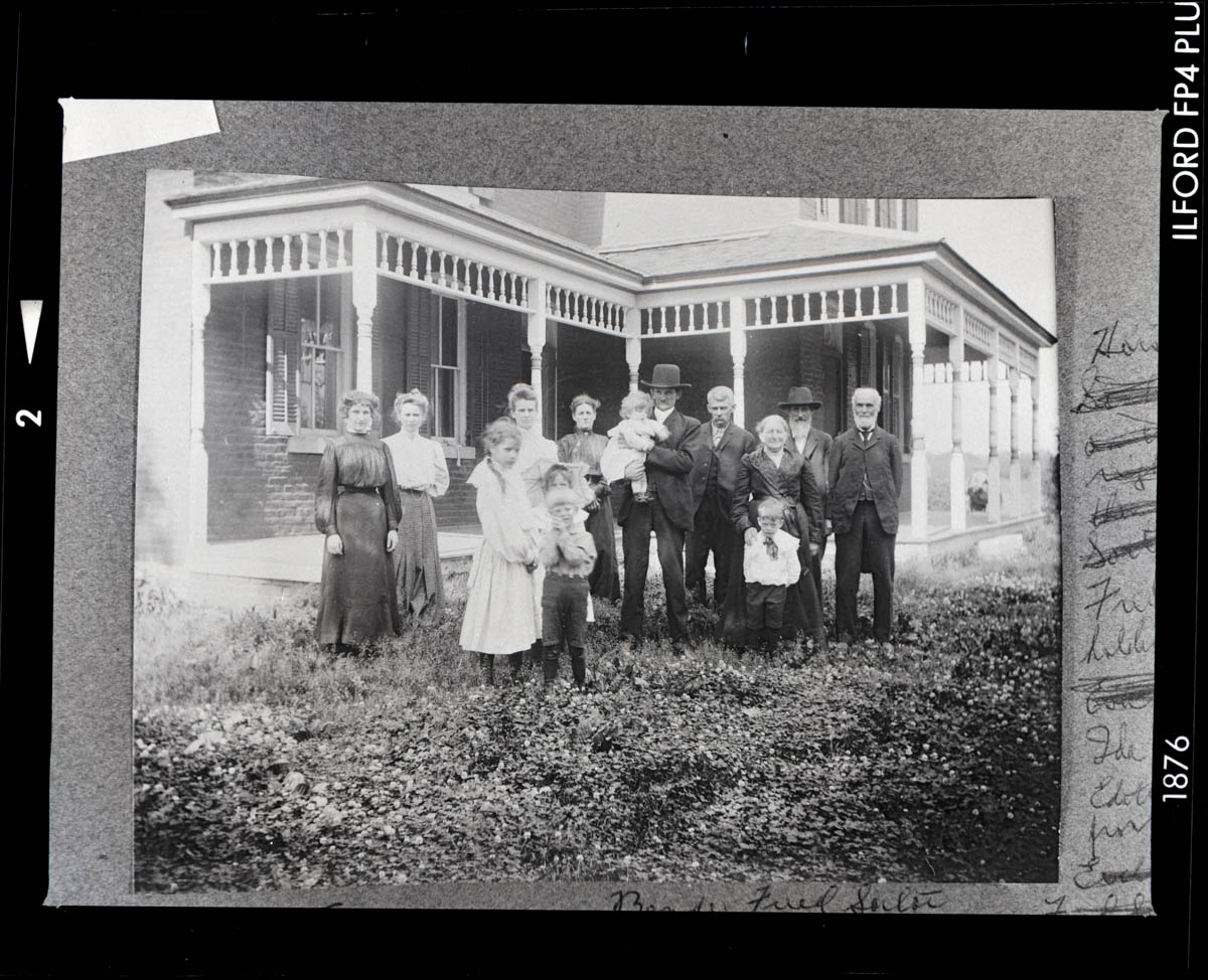 - Photograph of two families standing in front of a large house. Handwritten label on back says "Fred Sortor holding Alice, Henry Sortor to his left, to Henry's left the Soulier family. Unknown man in right of pix. To Fred's right, Ida Sortor, Eva Sortor, Henry's wife, to the rear right of Fred, Edith Sortor in front of Ida. Unknown woman and 2 children."
