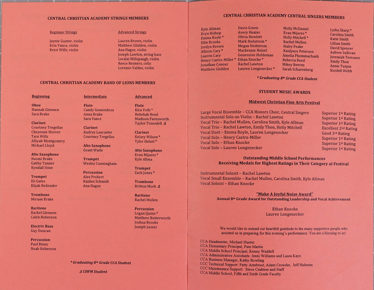 - Program for Central Christian Academy's 2016 Concert