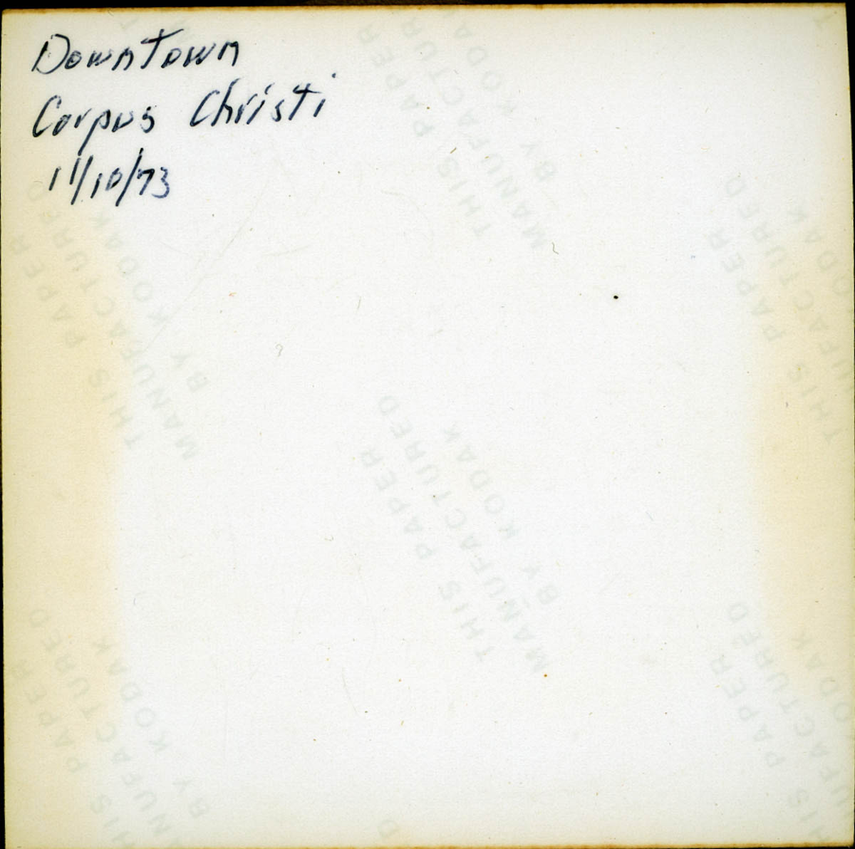 - Snapshot of a city by a marina. Handwritten label on back says "Downtown, Corpus Christi, 11/10/1973