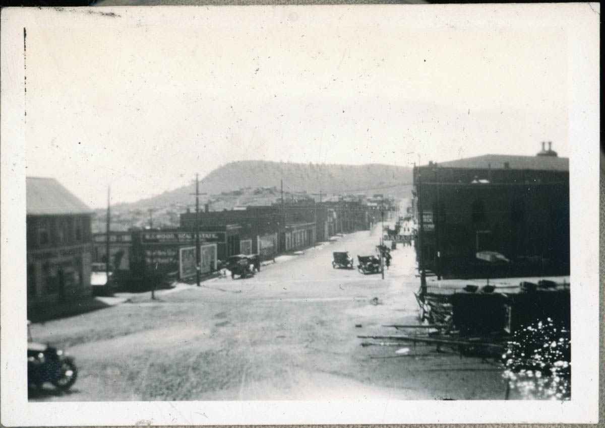 - Snapshot of a town in the mountains. Handwritten label on back says "Cripple Creek from depot." This is an item in a scrapbook.