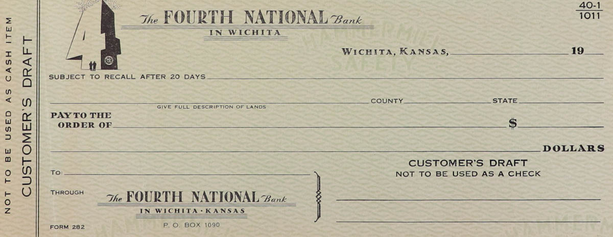 Unknown Author, “Fourth National Bank Check,” MHGS Digital Collections, accessed April 19, 2026, https://mhgswichita.org/om/items/show/19924.