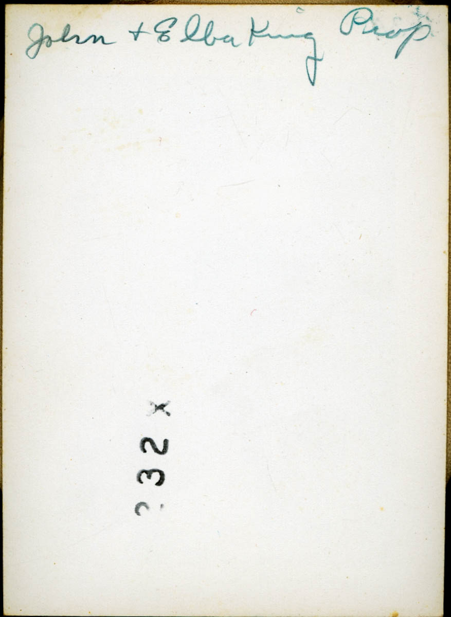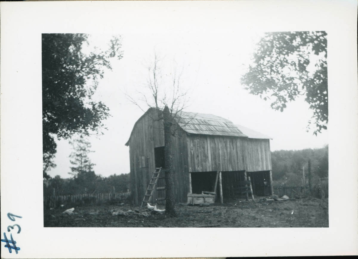 - Snapshot of a wooden barn. Handwritten label on back says "John & Elba King prop."