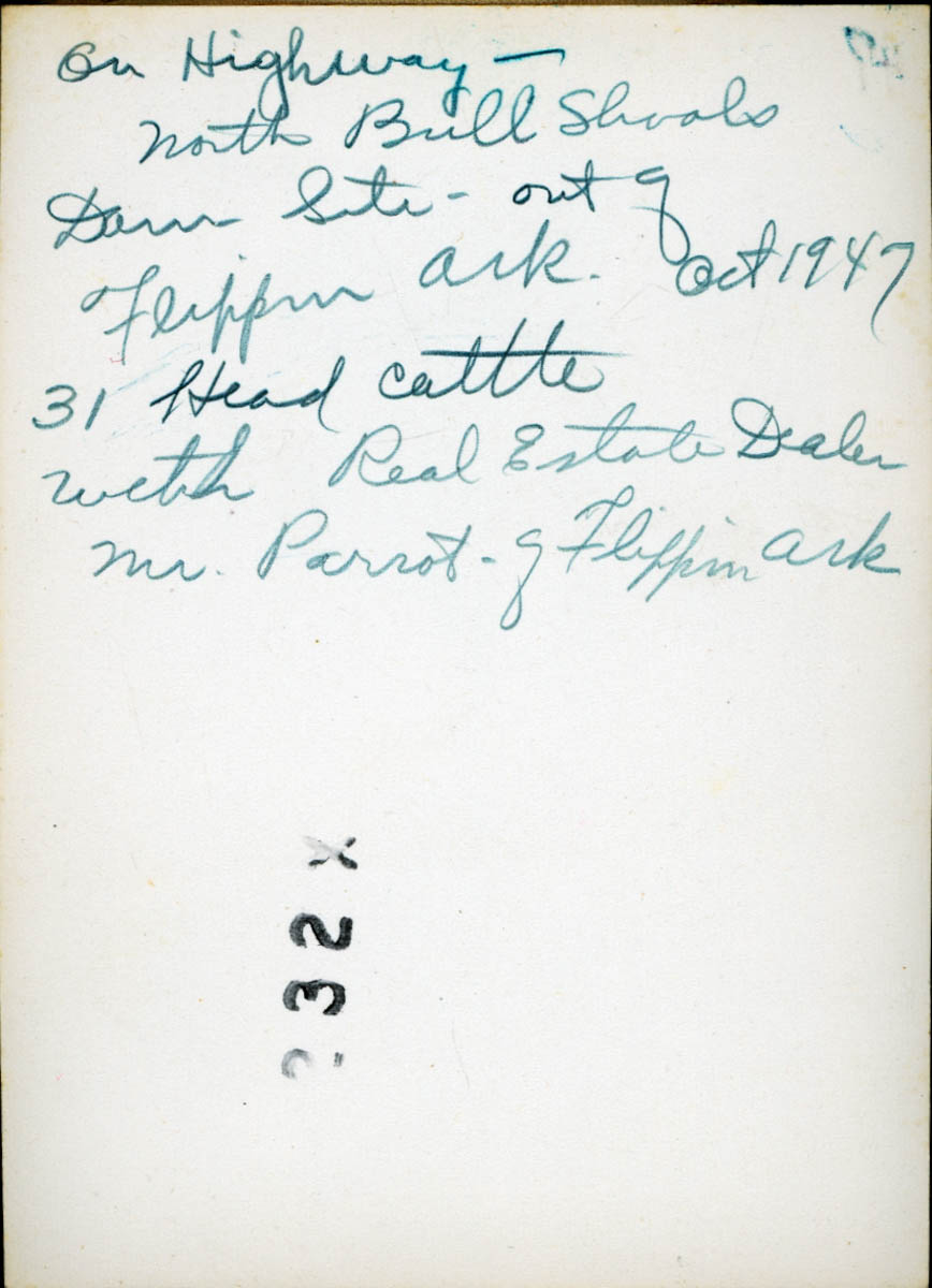 - Snapshot of a two men on horseback herding cattle on a road. Handwritten label on back says "On highway - North Bull Shoals Dam Site - out of Flippen Ark Oct 1947. 31 head cattle with Real Estate Dealer MR. Parrot of Flippin Ark."