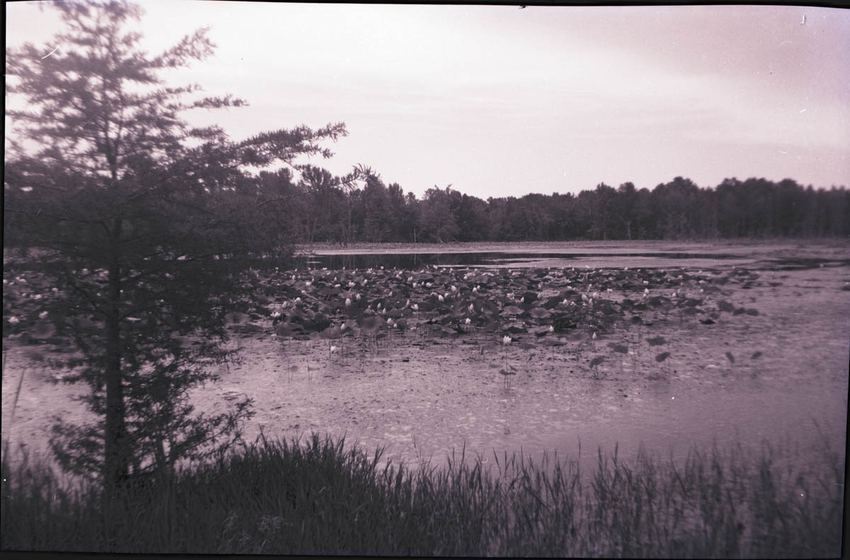 - Snapshot of a lake covered with water lillies. Handwritten label on back says "Picture of water lillies - back road out of Fordyce Ark. 7-15-70. Stayed A-OK Motel, Fordyce. Aunt Vonnie says Marie Settlemires and Alton Shivers (cousins) live there."