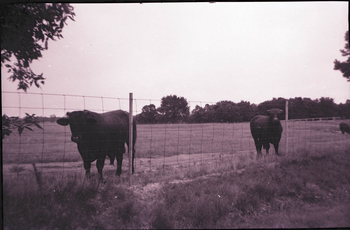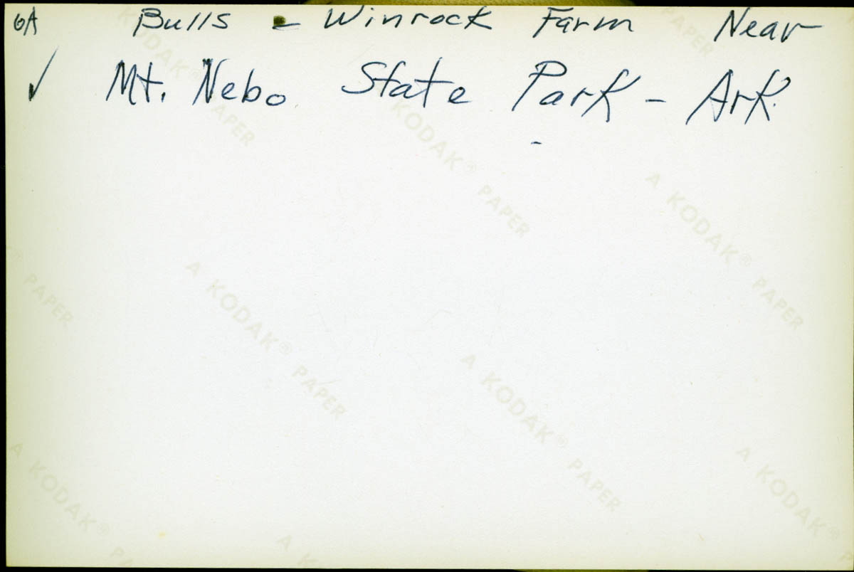 - Snapshot of bulls behind a wire fence. Handwritten label on back says "Bulls. Winrock Farm near Mt. Nebo State Park - Ark."