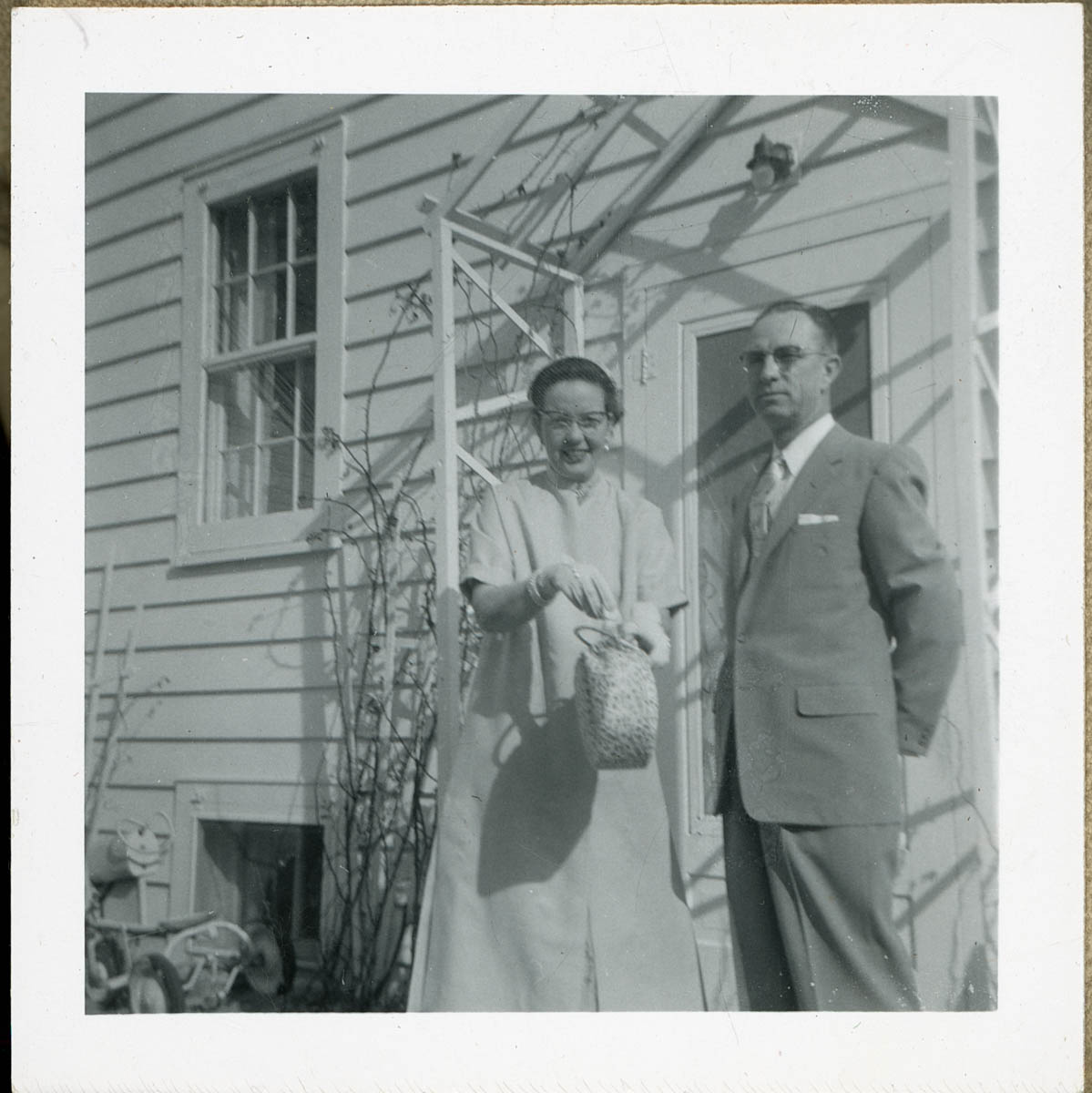 - Photograph of a man and woman standing outside a house. Handwritten label on back says "May 1956."