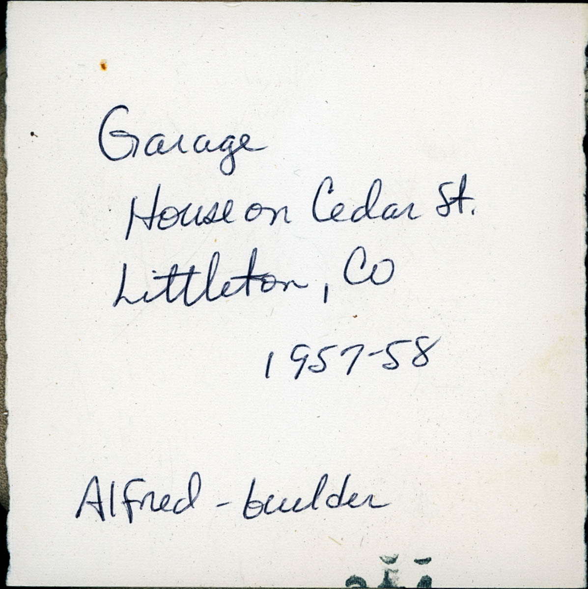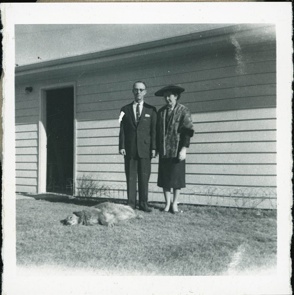 - Photograph of a man and woman with a dog. Handwritten label on back says "Garage. House on Cedar St Littleton, Co 1957-58. Alfred - builder."