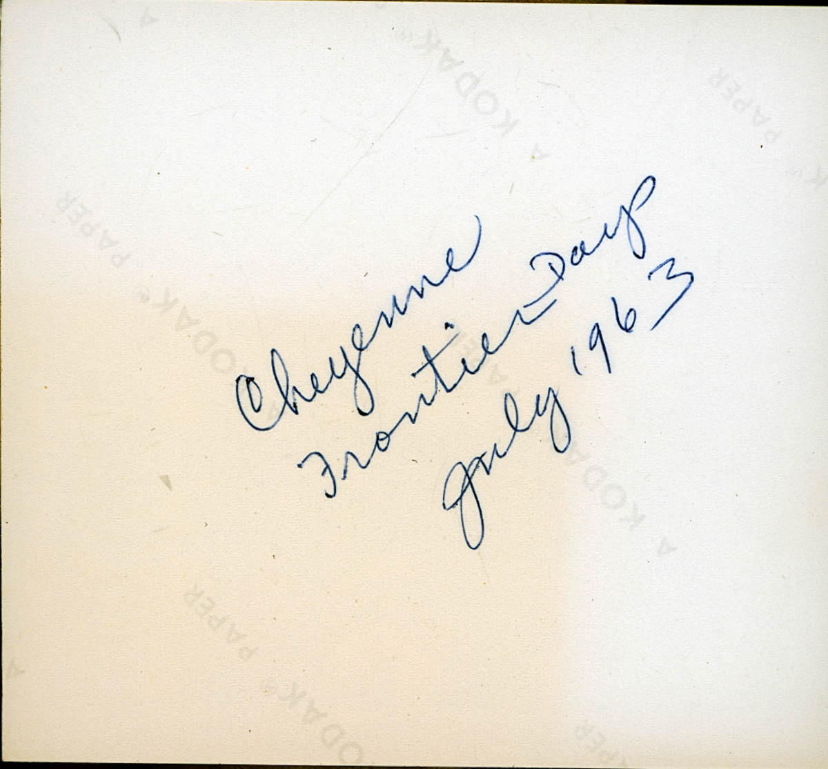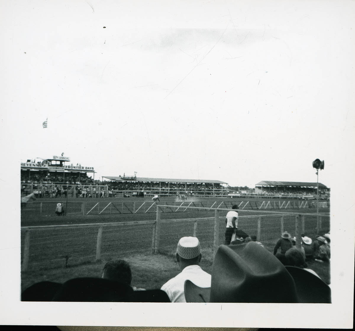 - Photograph of a wild west show. Handwritten label on back says "Cheyenne Frontier Days July 1963"