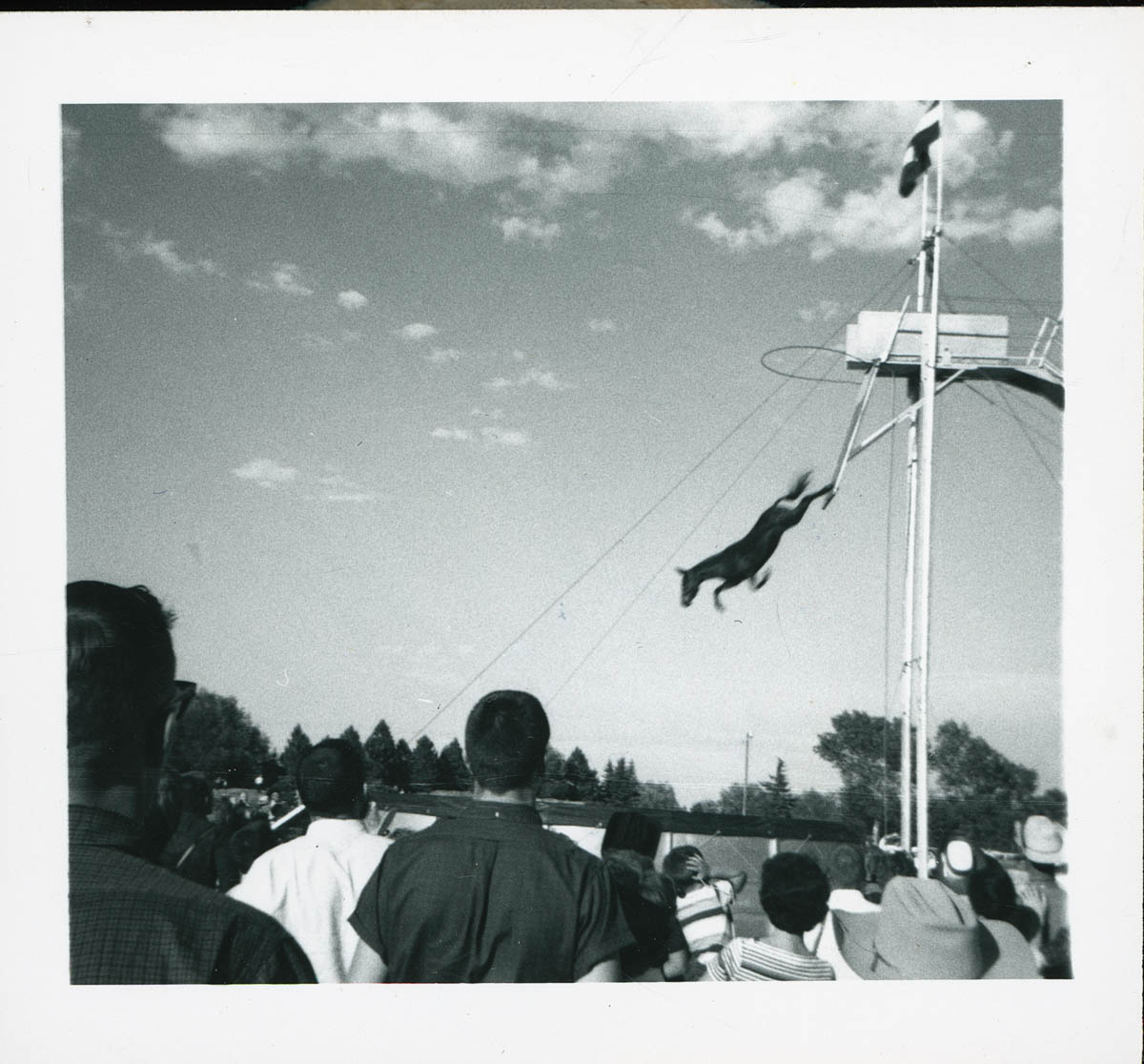 - Photograph of a horse diving into a pool at a wild west show. Handwritten label on back says "Cheyenne Frontier Days July 1963"