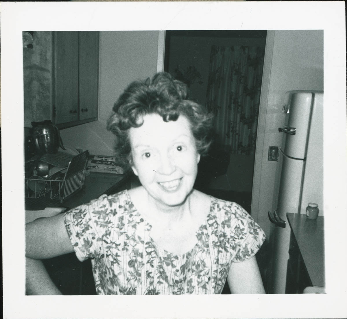 - Photograph of a woman standing in a kitchen. Handwritten note on back says "August 1963."