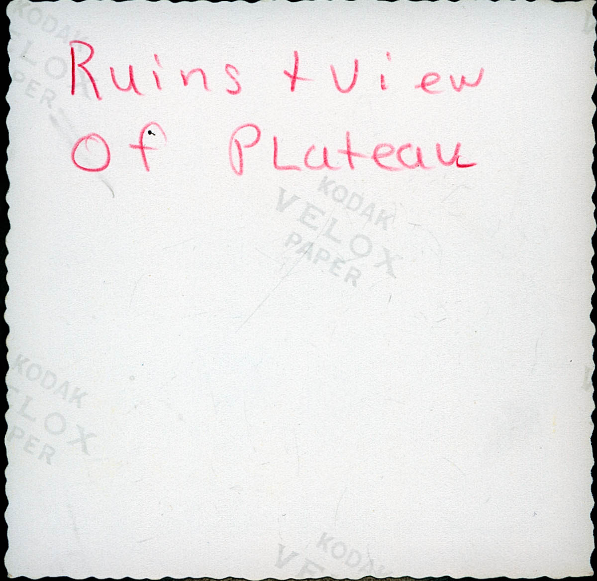 - Photograph of a plateau and cliff. Handwritten note on back says "Ruins & View of Plateau."