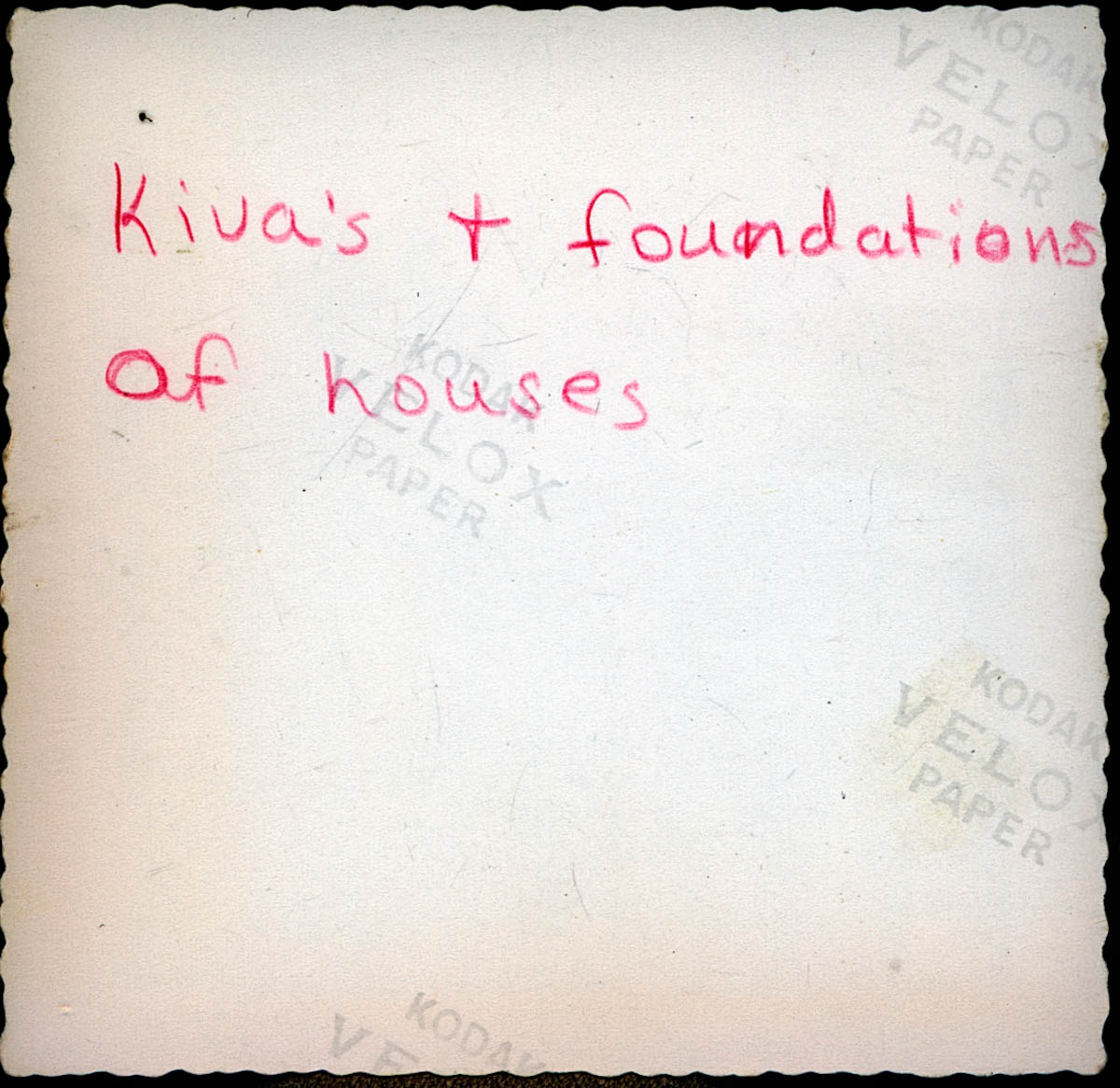 - Photograph of a display at a national park. Handwritten note on back says "Kiva's & foundations of houses."
