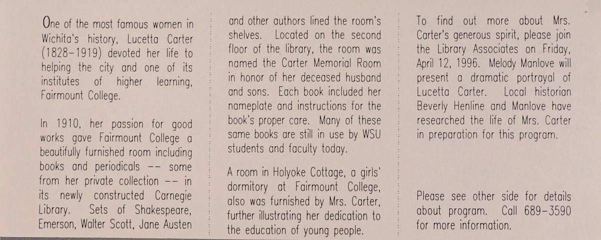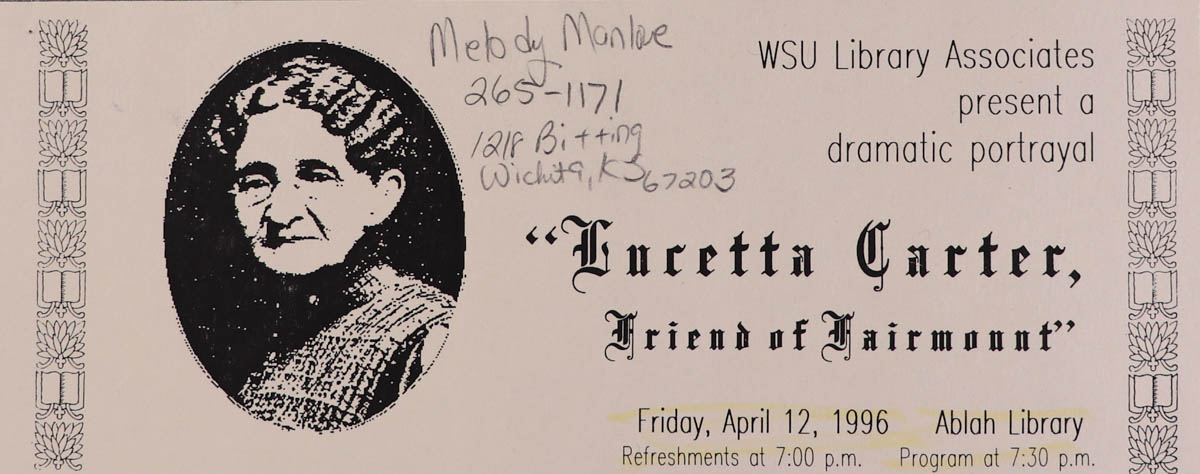 WSU Library Associates, “Ticket for a Performance of "Lucetta Carter, Friend of Fairmount" at WSU,” MHGS Digital Collections, accessed April 19, 2026, https://mhgswichita.org/om/items/show/20170.
