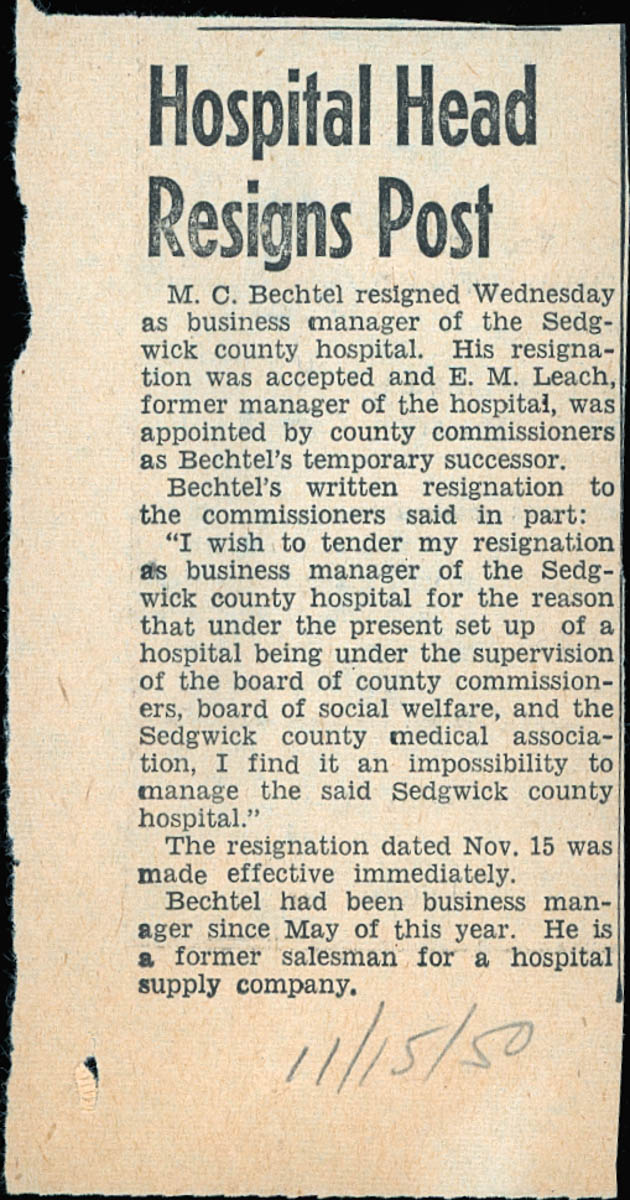 Wichita Eagle, “Article About M C Bechtel Resigning as Business Manager of Sedgwick County Hospital and E M Leach Appointed as Replacing Him,” MHGS Digital Collections, accessed April 16, 2026, https://mhgswichita.org/om/items/show/20250.