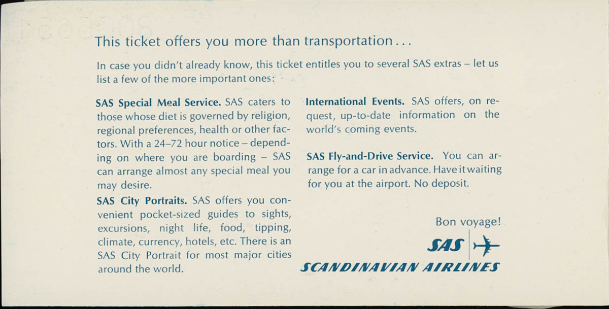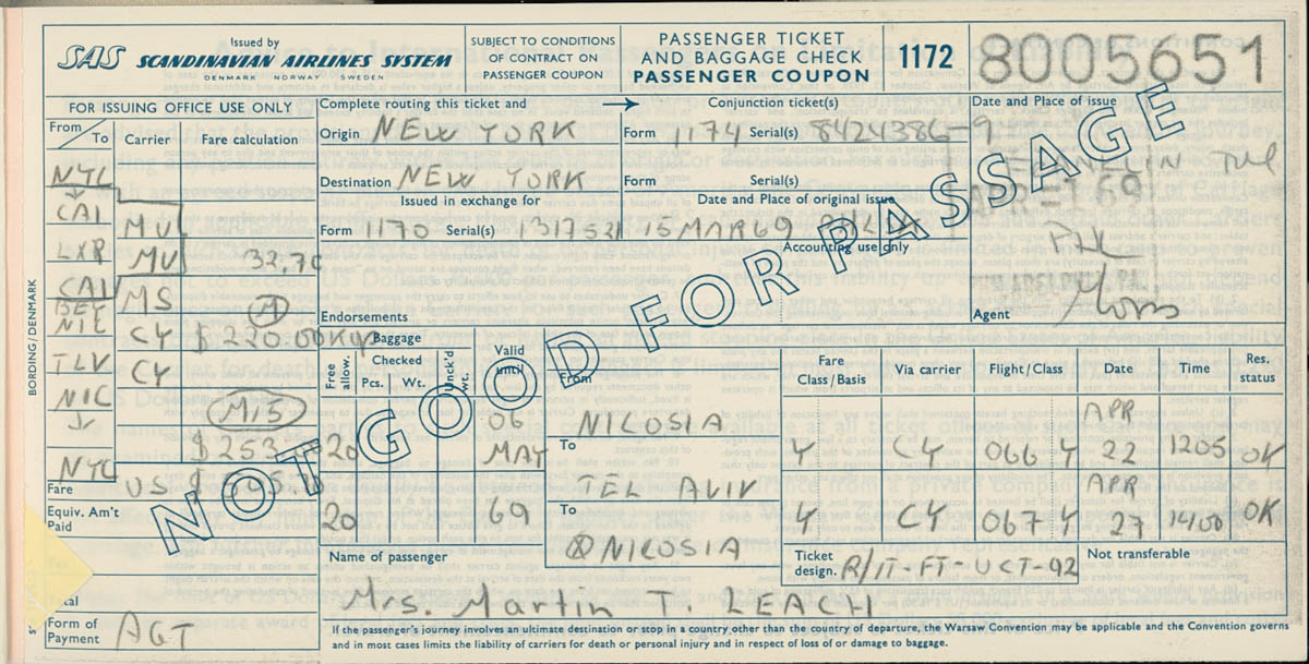 Scandinavian Airlines System, “SAS Round Trip Plane Ticket from New York to Cairo, Tel Aviv and Nicosia,” MHGS Digital Collections, accessed April 19, 2026, https://mhgswichita.org/om/items/show/20323.